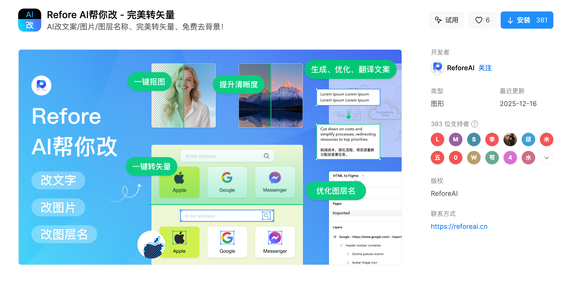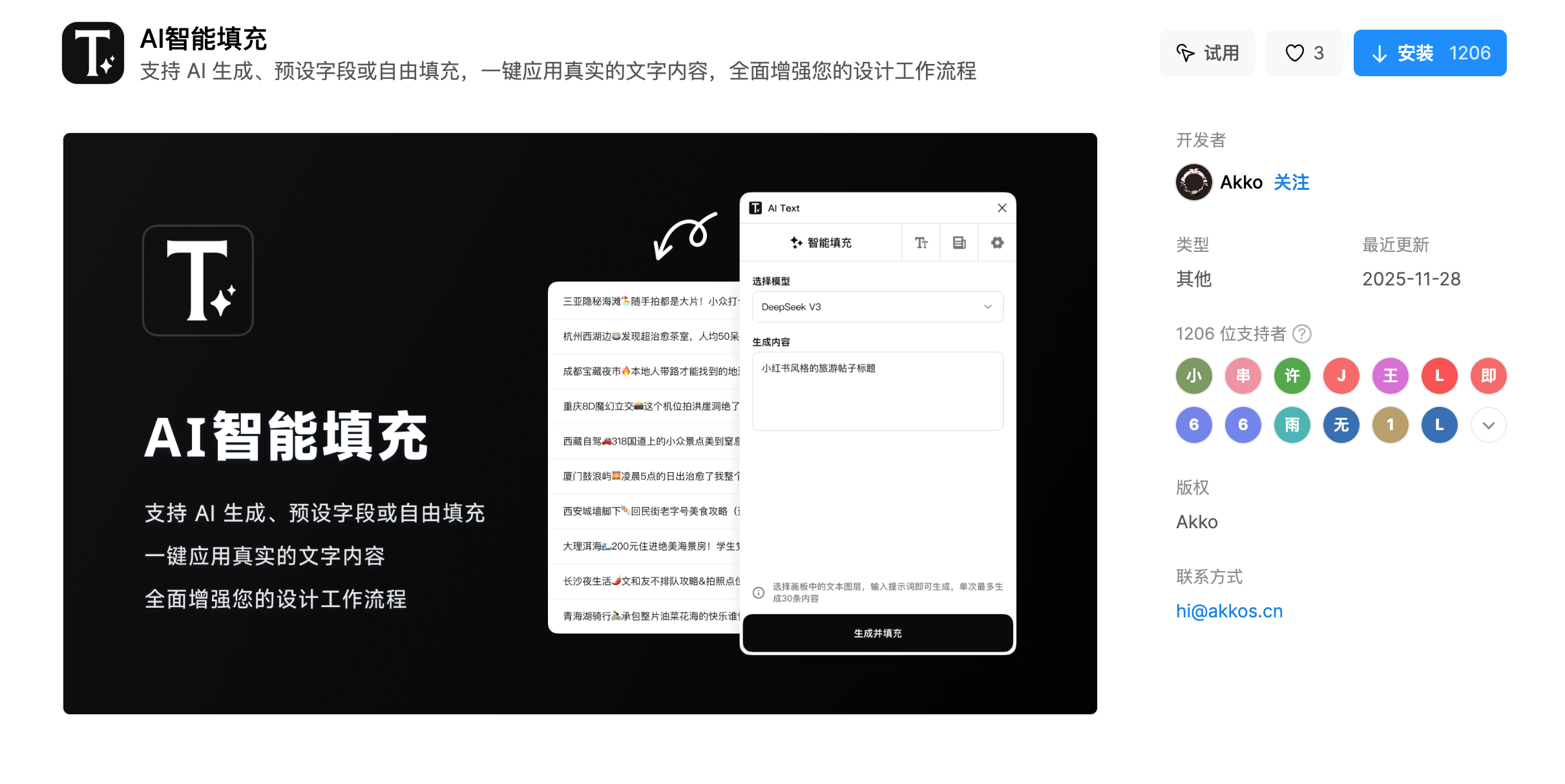 说到AI,即时设计也紧跟趋势。它的AI智能填充插件特别好用——你可以用AI生成文案、自动填充内容,甚至让AI帮你优化设计稿。