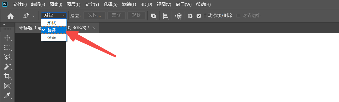 step2 选择钢笔工具的路径模式,选择 “路径” 而非“形状”或“像素”。