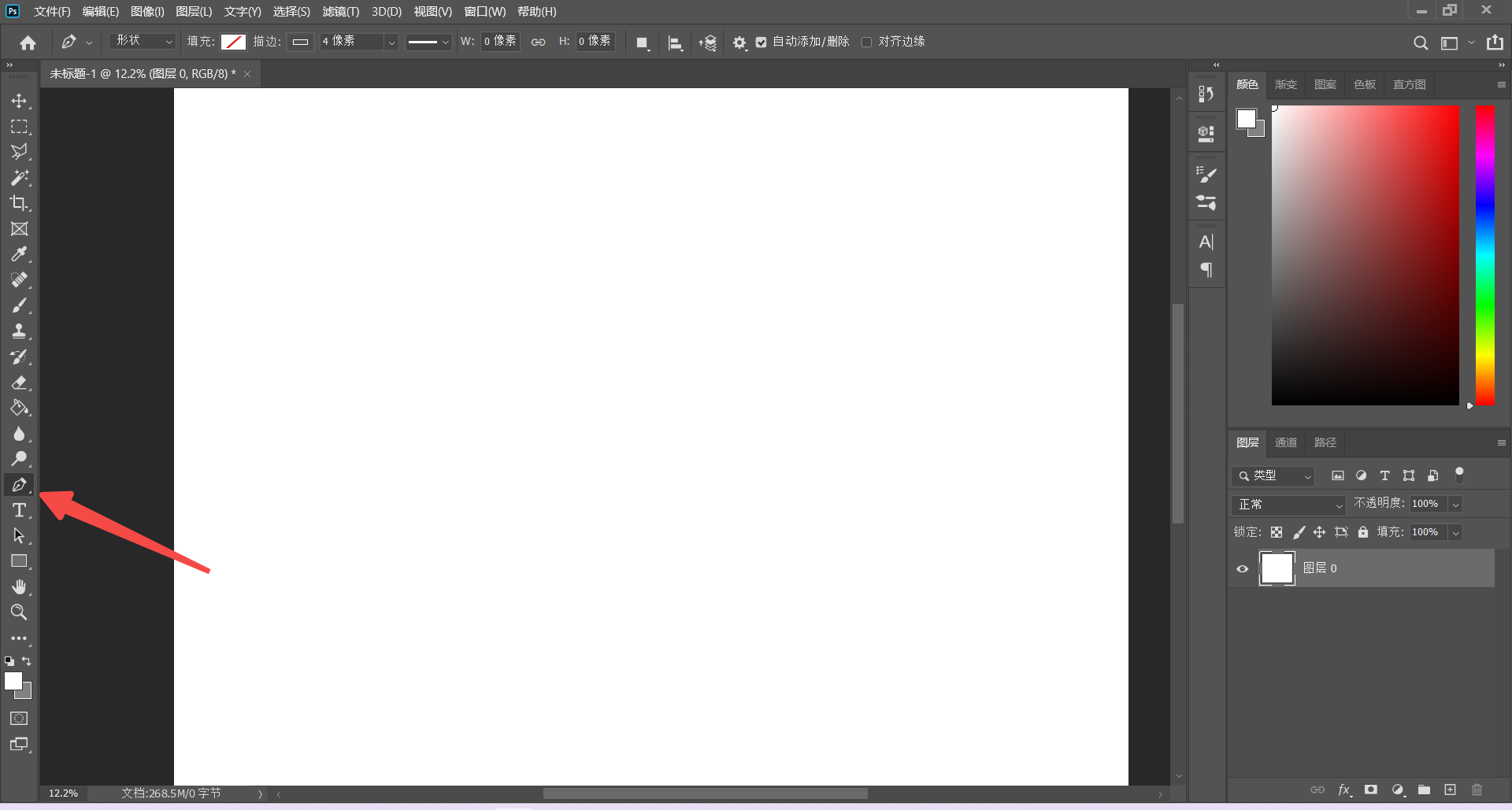 step1 打开 Photoshop,新建一个适合尺寸的画布,选择钢笔工具: