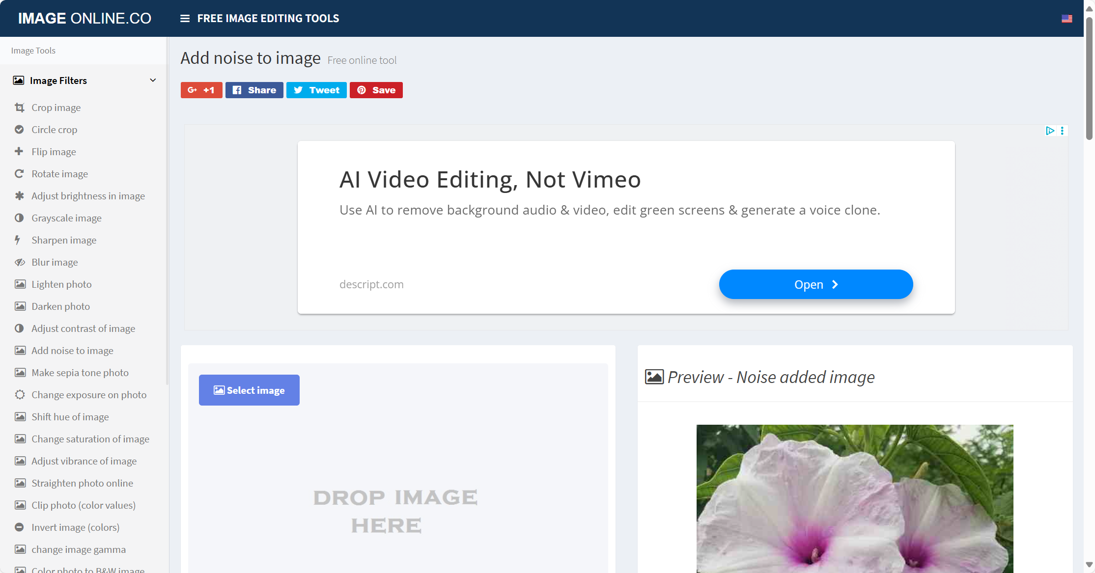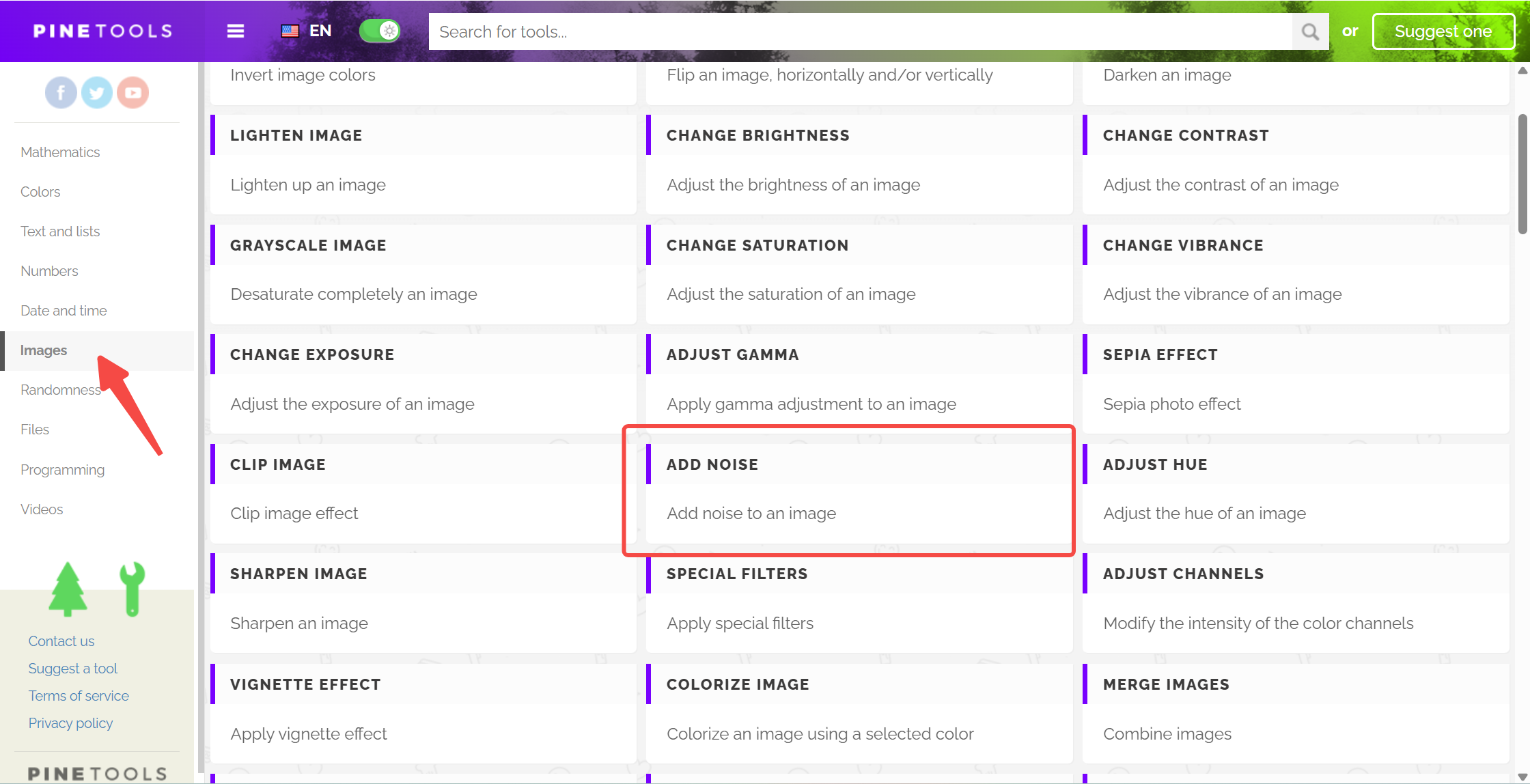 PineTools 是一个功能极其全面的在线图像处理平台,其中包含“Add Noise”的独立模块,可直接实现在线免费添加图片噪点。它界面简洁、加载迅速,非常适合想要在短时间内完成图片加噪、色彩调整或基础编辑的用户。