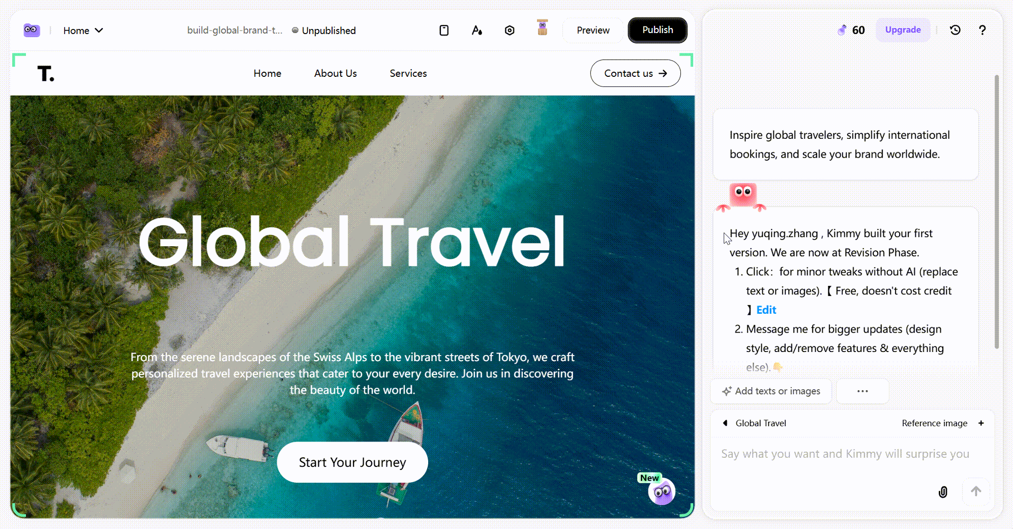 - 支持从文字描述生成可交互界面,也包含主题风格自定义、本地化翻译、文案优化、用户体验优化等AI功能