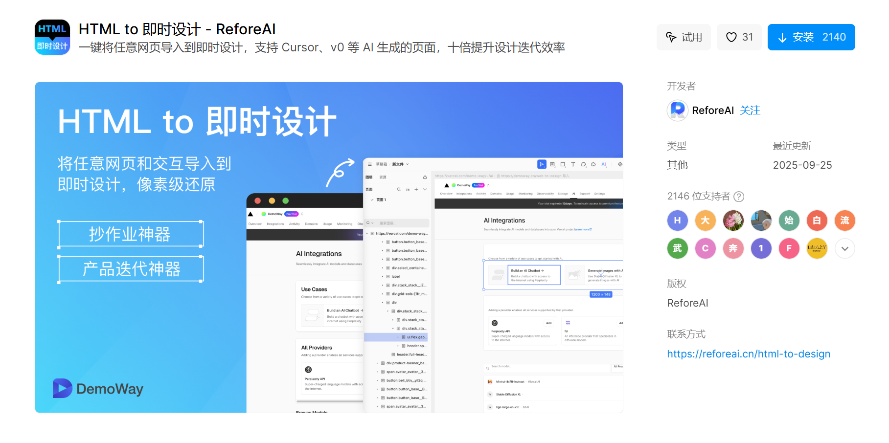 如果你想修改或优化 Cursor 平台生成的高保真原型,可将生成的 html 代码文件导入即时设计中进行编辑、优化。HTML to 即时设计是一款加速产品 UI 设计迭代的插件工具,可以一键将任意网页和交互导入到即时设计,实现像素级还原。是一款抄作业神器,快速将优秀设计无缝融入你的产品,效率翻倍。