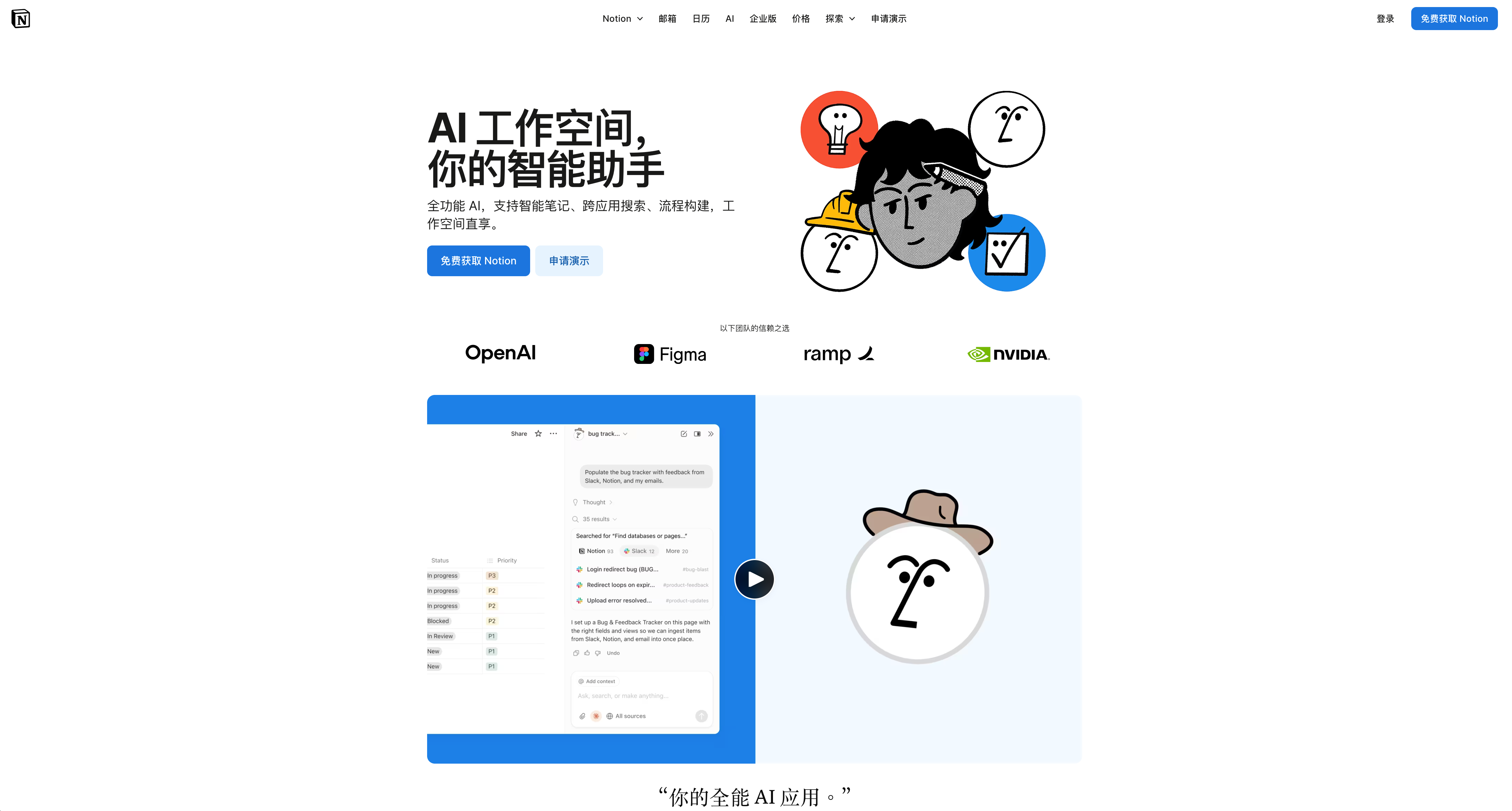 Notion本身就是一个强大的线上笔记软件和协作平台,加入AI功能后如虎添翼。它不仅能做笔记,还能管理项目、数据库、Wiki,是真正的"第二大脑"。