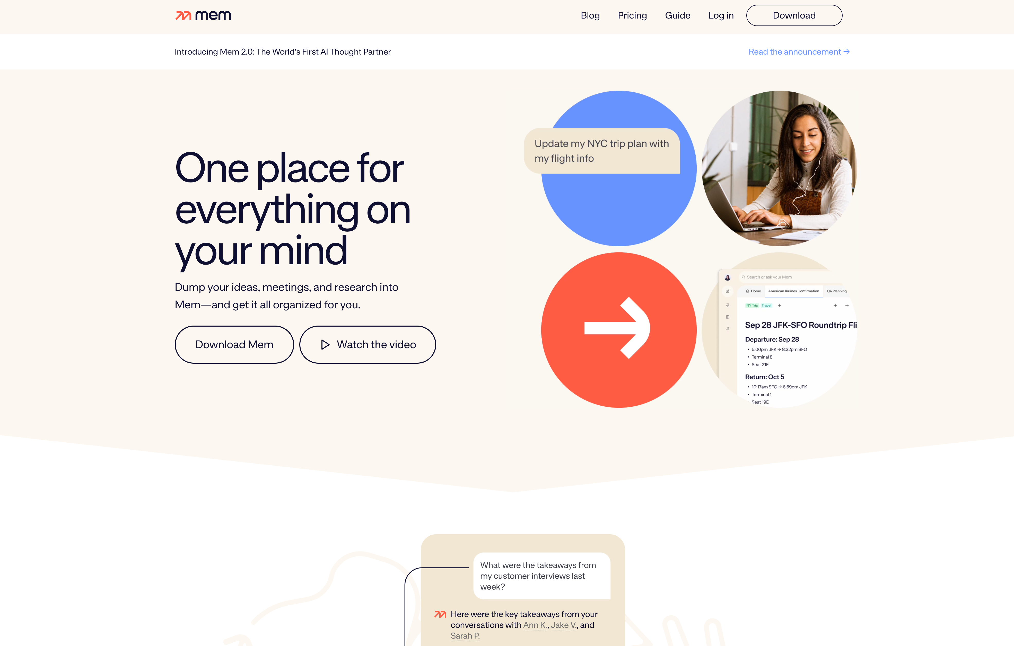 简介:Mem.ai是一款从零开始为AI设计的笔记工具,它的理念是"让AI帮你组织一切"。你只需要把想法丢进去,AI会自动分类、关联、总结。