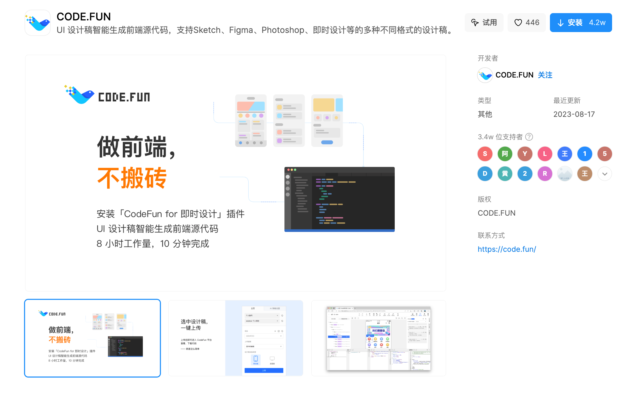更重要的是,现在有很多专门为设计师打造的设计稿转代码工具。比如即时设计的CODE.FUN插件,能够直接把你的设计稿一键转换成前端代码。