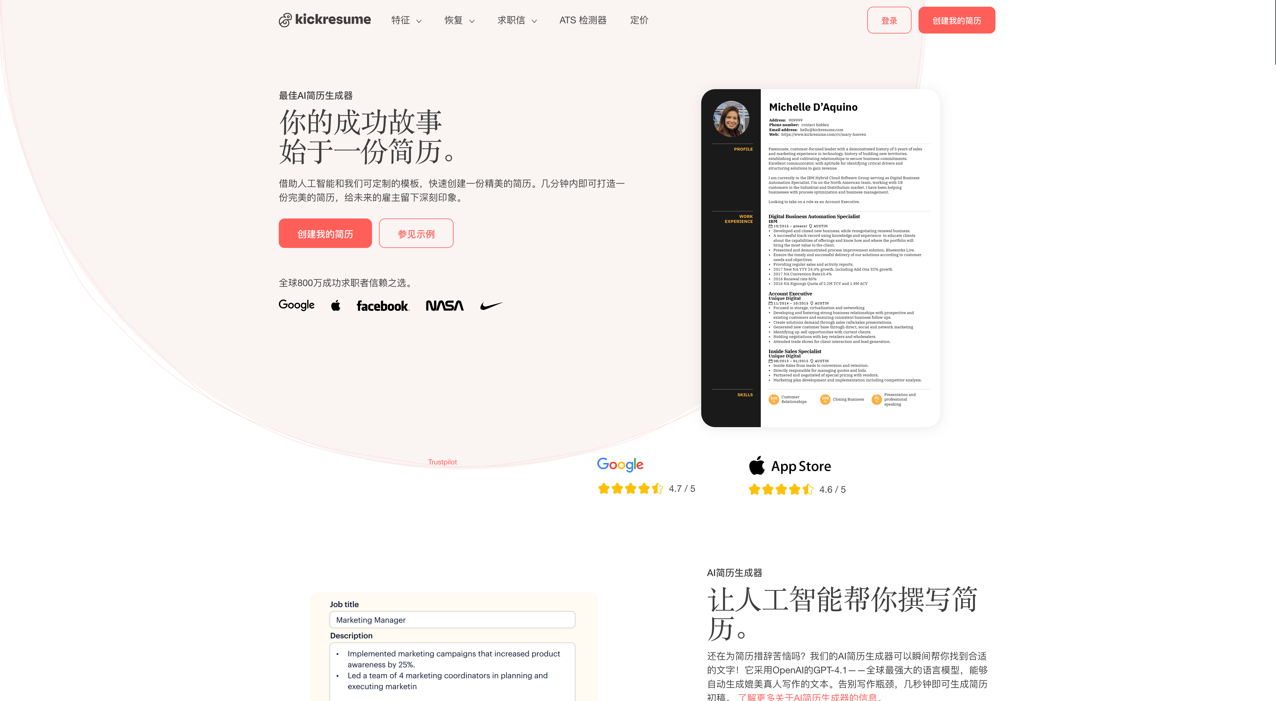 - 强调内容质量:通过 AI 生成匹配岗位的、有逻辑的工作经历和技能表达。