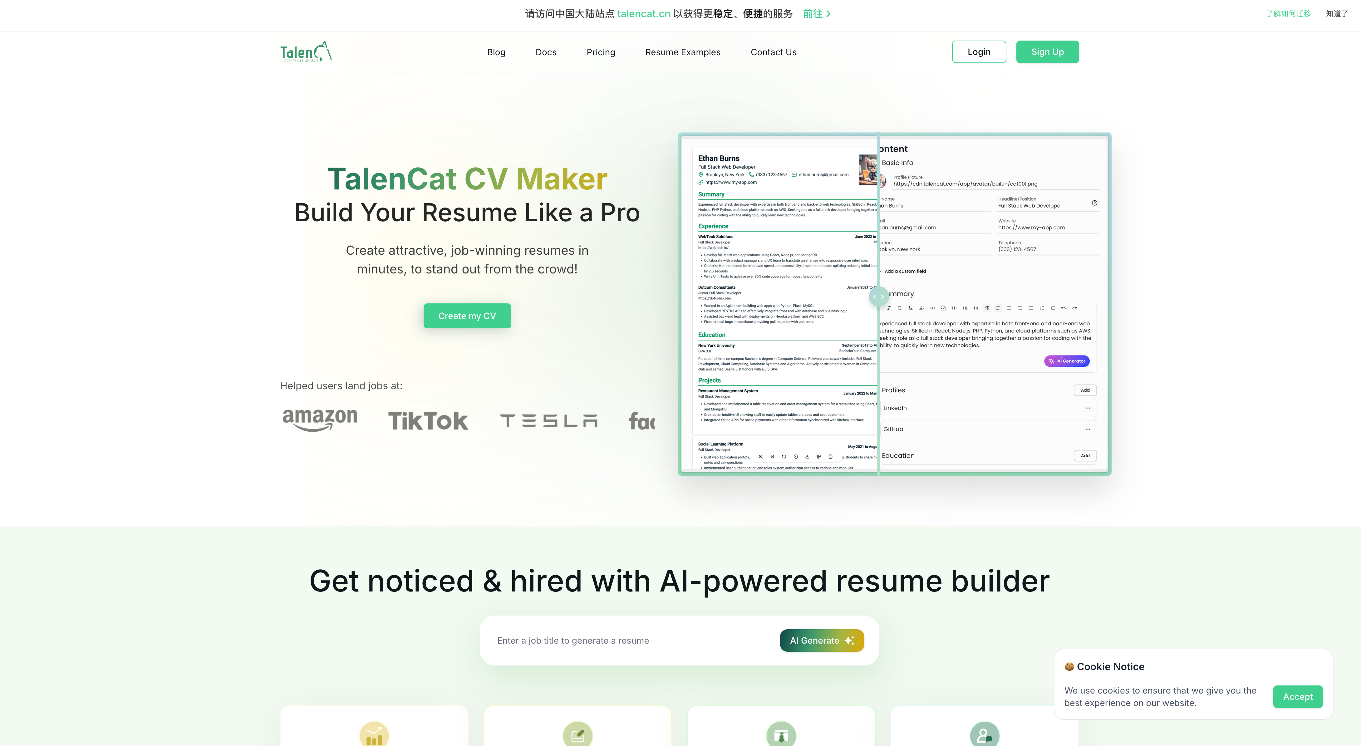 TalenCat(天才猫)是一款注重 AI 写作 + ATS 优化 +内容设计的平台,面向想快速创建专业简历的用户。