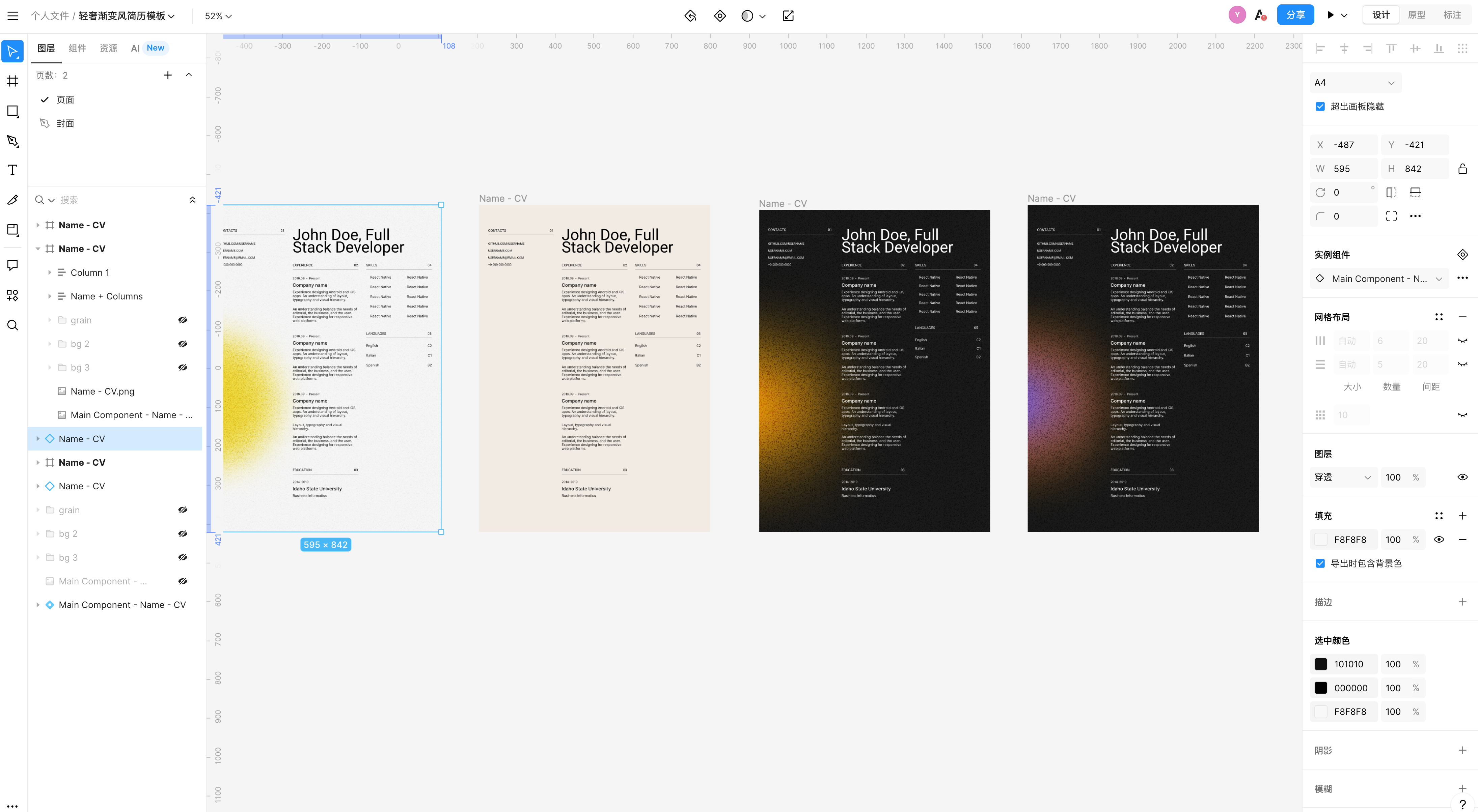 - 高度灵活:相比那些局限于固定模版列、固定排版格子的简历工具,你可以在即时设计里自由拖放文本模块、图标、图片,视觉风格更自由。