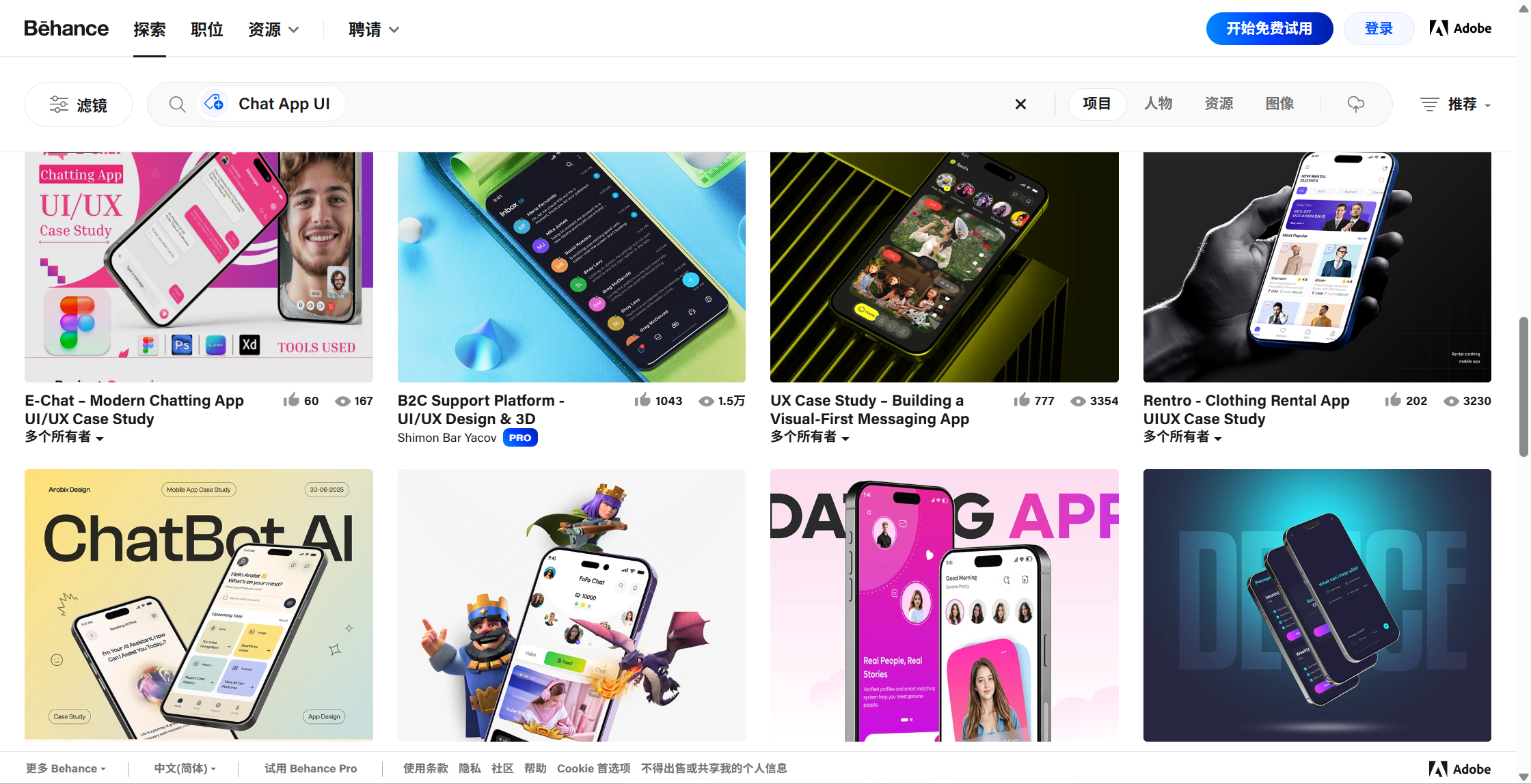 - 搜索你想找到的任何风格的聊天界面设计,例如通过“Chat UI”、“Messenger App UI”等关键词寻找灵感。