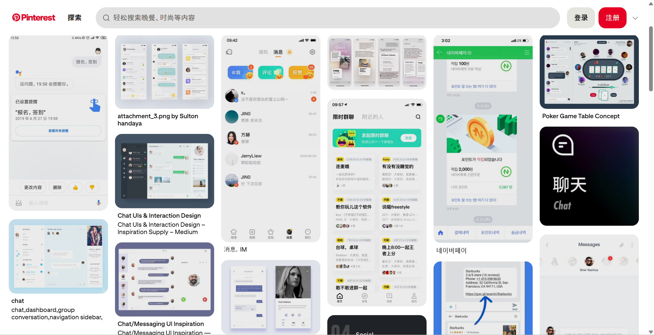 💡适用场景:当你想快速浏览不同风格(如极简风、拟物风、暗黑风、卡通风等)的聊天界面设计时,Pinterest 是非常直观的入口。