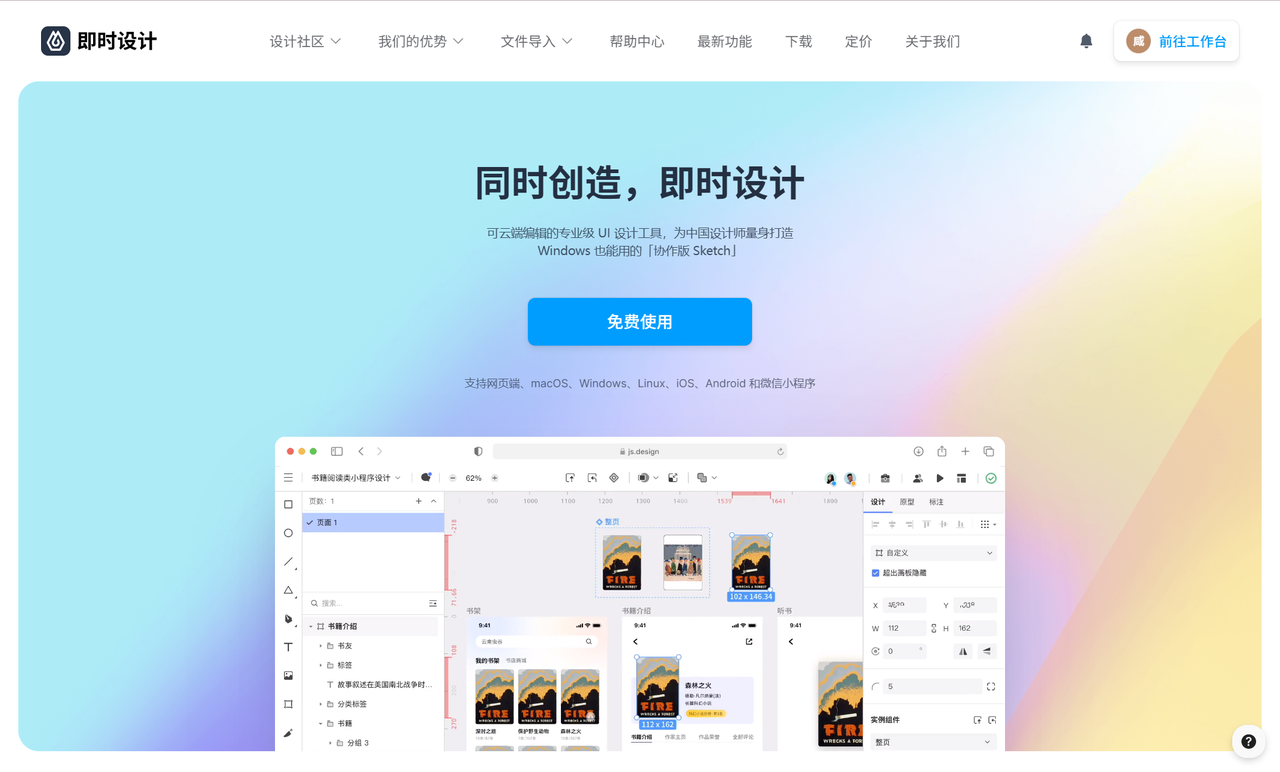 即时设计师国产的一款专业级的 UI 设计工具,能够实现云端编辑和团队在线协作,支持 PS、AI 的大部分功能,能够支持网页端、macOS、Windows、Linux、Android和微信小程序等多平台登录创造,没有使用设备的限制,是为中国设计师量身打造的设计平台和电脑画图软件。同时,即时设计对所有的个人设计师免费开放,并提供了海量的模板与插件与交流社区,便于设计师们在其中寻找灵感、参与讨论,真正实现多方协作。