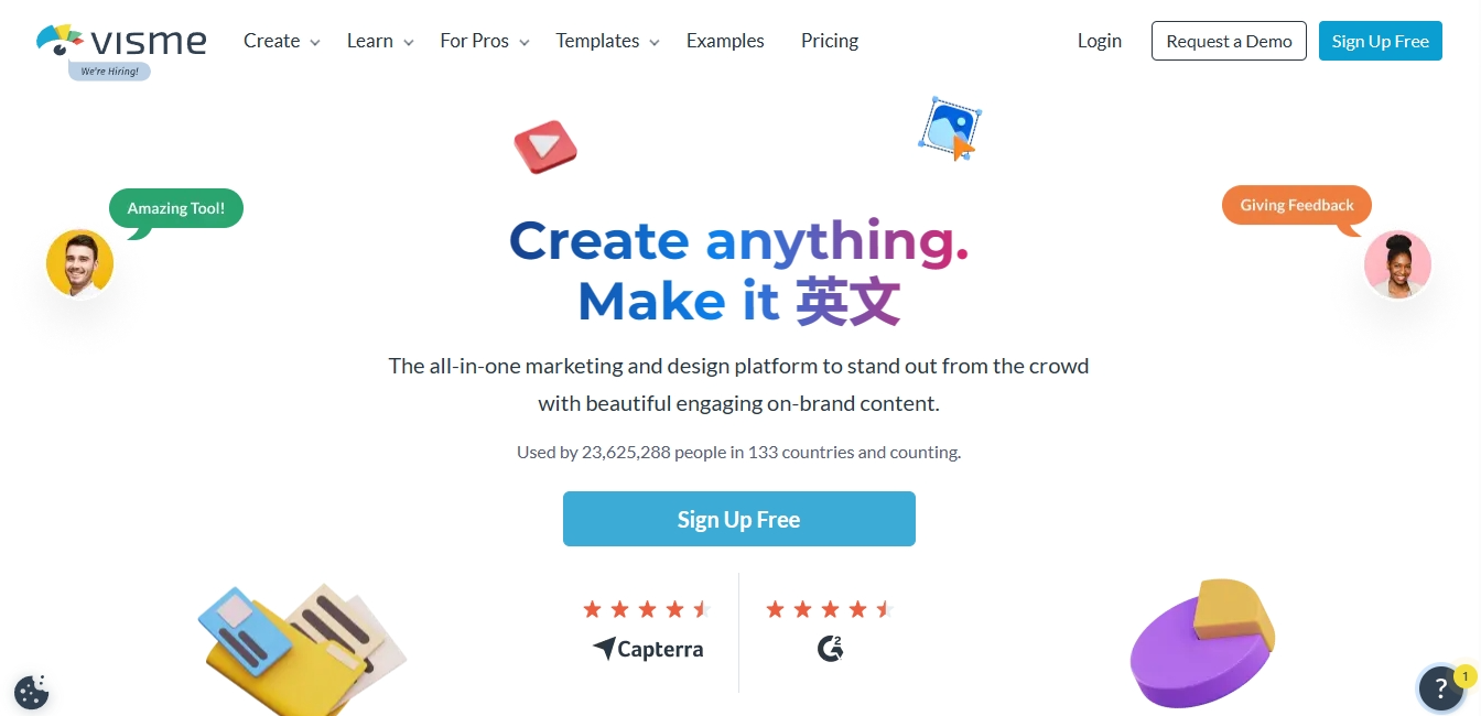 Visme 是一款专业的封面设计软件,有数以千计的可自定义模板,涵盖 50 多种内容类型,用户能够自己使用各种工具或者贴纸来设计各种封面,还能将数据可视化,生成视频等等,功能也是十分丰富的。
