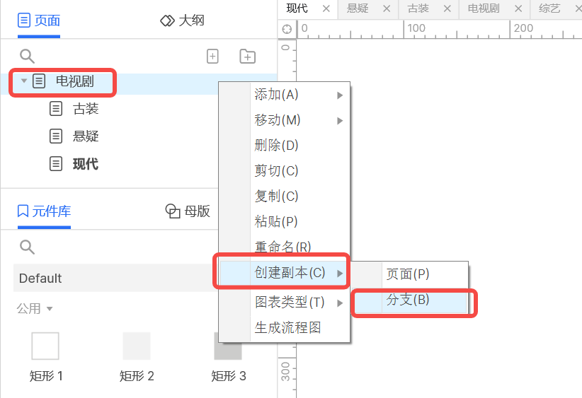 如果你想再创建一个上面这种分支,有一个很简单的方法,不需要自己再单独去添加子页面。只需要选择你想复制的这个分支,例如电视剧这个页面,那就右键单击「电视剧」,点击「创建副本」–「分支」,这个整体就会一起被复制。