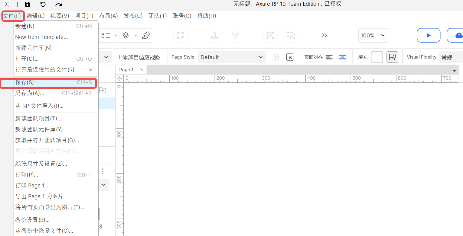 当你设计完成后,再一次点击「文件」–「保存」,为了以防万一,一定要多保存几次。因为 Axure 制作原型图真的比较耗费时间,所以一定要养成及时保存的习惯,以免自己创建完的页面丢失不见。