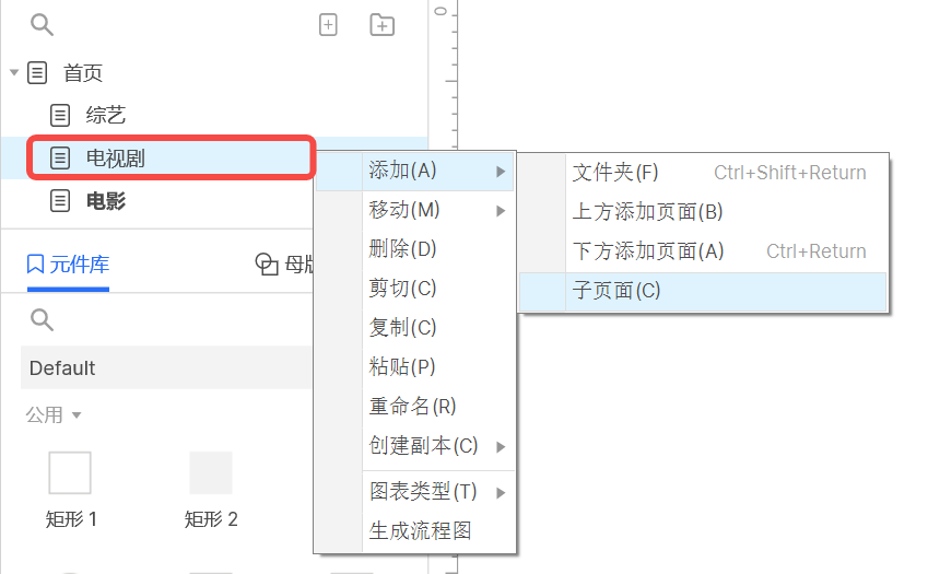 这三个子页面的位置顺序可以通过拖拽来进行调整。如果想要原型设计更加丰富,可以再继续给其中的分支添加新的子页面,例如给“电视剧”再添加三个子页面,还是右键单击「电视剧」进行子页面的添加。
