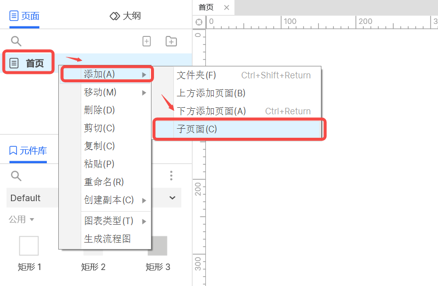 Axure 一般会默认一个空白页面,这里给它命名为“首页”,然后我们就可以给首页添加新的子页面,右键单击「首页」,点击「添加」–「子页面」,然后根据你的需求输入子页面的名字,这里以“综艺、电视剧、电影”为例。