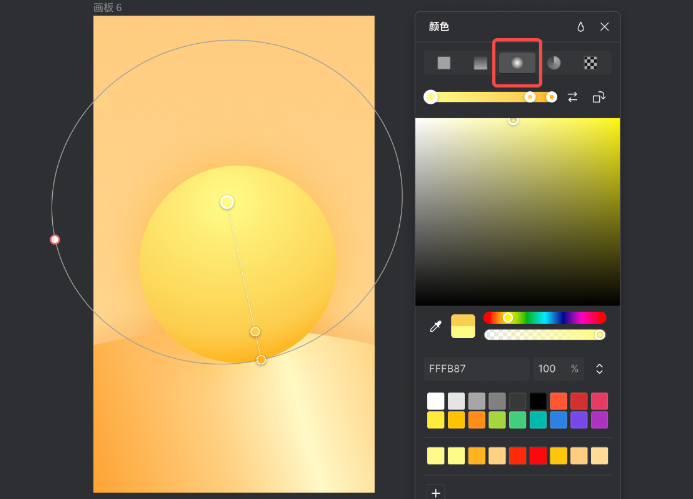 - 颜色参数:径向渐变 由左上至右下 #FFFB87 - #FCCE4E - #FFB41F 。