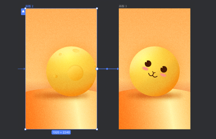 - 复制出画板 2 将月球移动到画板内(参考左侧示意图)并旋转角度 0 。