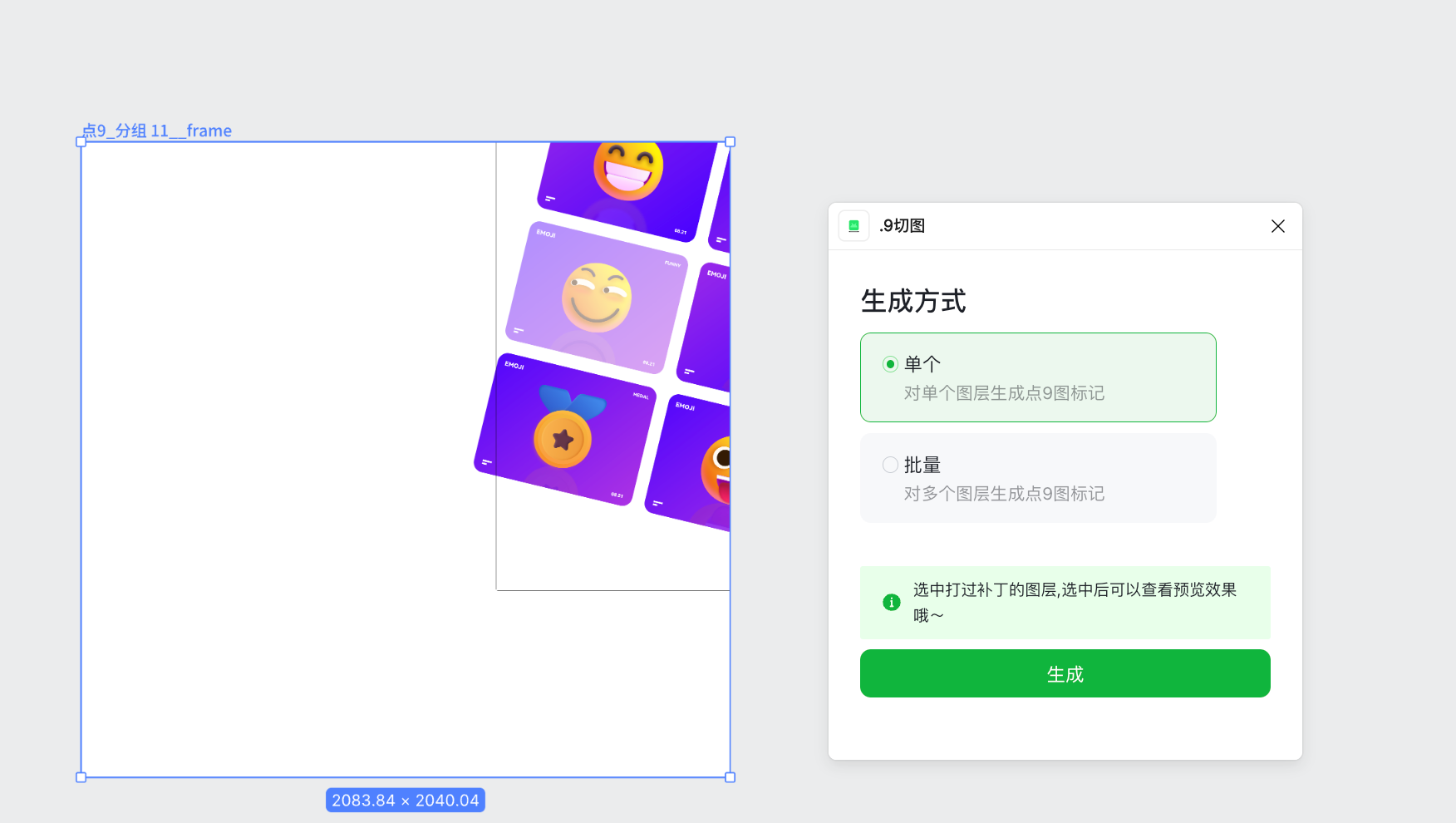 使用该插件,你只需要在即时设计搜索安装插件,然后回到编辑台,调取工具栏或者使用快捷键键 E,打开.9 切图的插件,然后选中需要制作切图的组件,选择生成方式,然后点击生成就可以一键生成所有.9 切图。它会自动计算切片位置,进行打补丁预览,免去了手工计算与制作的麻烦。相比传统手工切图方式,尤其是项目内容特别的多时候,它能节约超过 70% 的重复工作量。