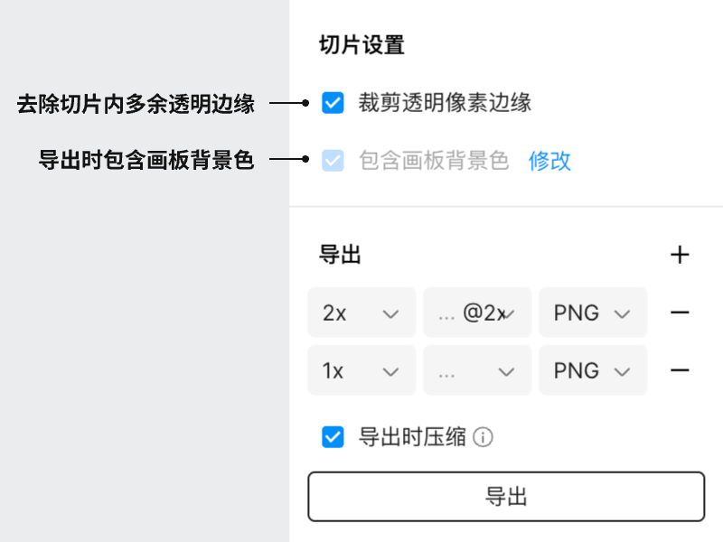 切图的时候,在即时设计里是可以选是不是按切片的真实大小来切的,要是打勾 “裁剪透明边缘”, 就只切有效内容的部分,周围透明的地方直接划掉,这样切出来的图片就不会有多余的透明区域看着乱七八糟的。还有如果是在画板里直接切图的,右边面板里面会有导出背景色的选项。点 “修改” 就可以跳到画板设置里面,想要背景色的话就勾选上 “导出时包含背景色”, 不需要的话取消勾选掉就行了。这样下来就可以灵活切出需要的部分,而不是整张图都输出出来,可以大幅度提升导出切图的效率啦!这些小设置掌握好了,导图的操作就简单又快捷多了!