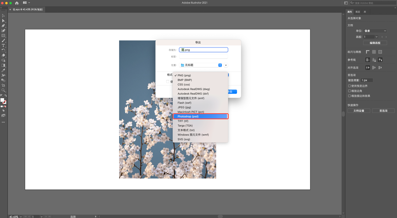 在图层合并完成后,我们需要将 EPS 文件导出为 PSD 文件格式,以便后续在 Photoshop 中进行编辑。在 Adobe Illustrator 软件中,点击 “文件” 菜单,选择 “导出” ,然后选择格式为“ Photoshop( PSD )”,并选择保存位置和文件名。最后,点击“导出”按钮,即可成功将 EPS 文件导出为 PSD 文件格式。