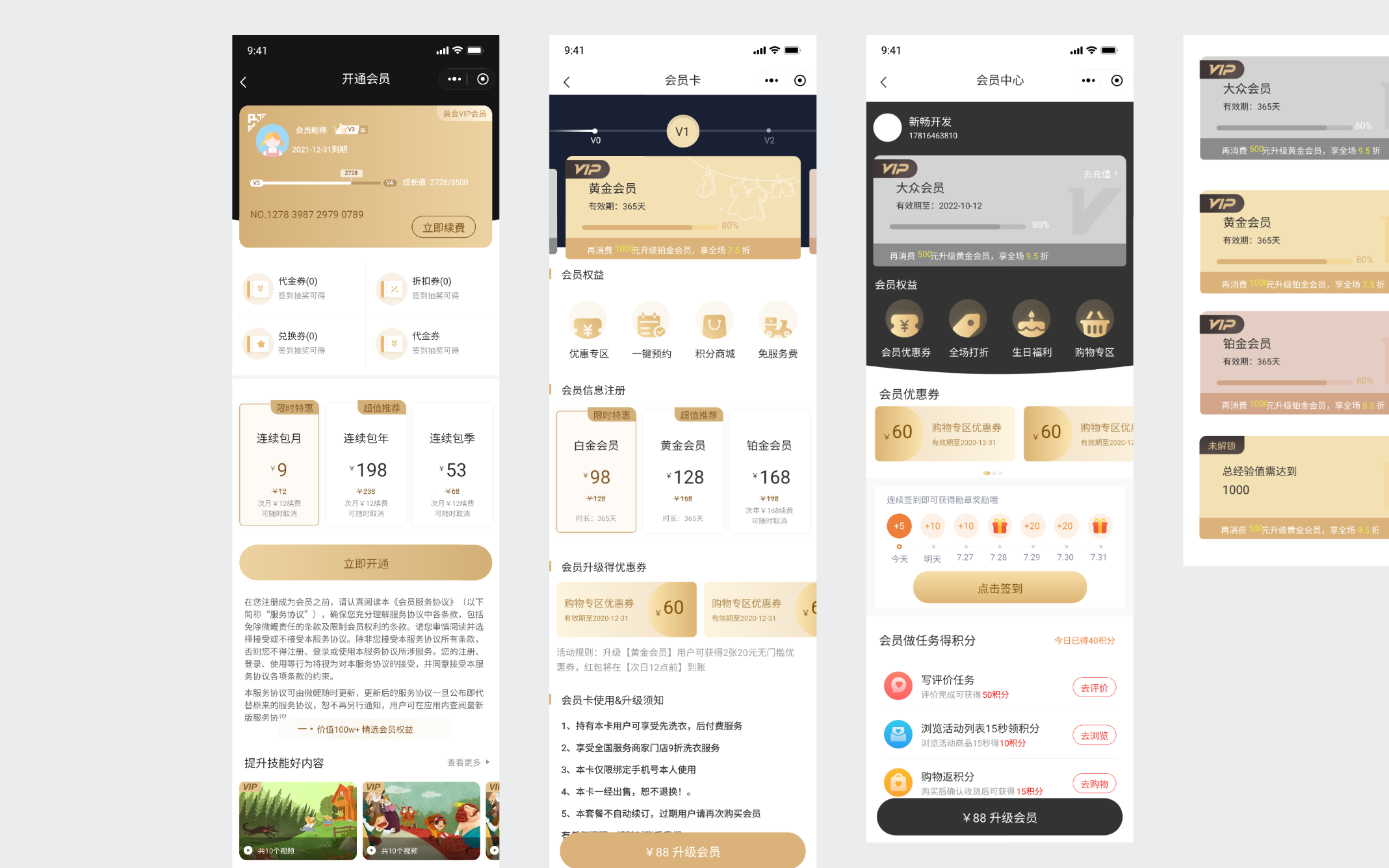会员页面的 UI 设计采用了黑色和金色的色调,给人一种简洁高级的感觉,在用户的会员卡片和会员权益、开通按钮上都设计为金黄色,暗示用户会员的独特之处,可以起到吸引用户开通会员的作用。