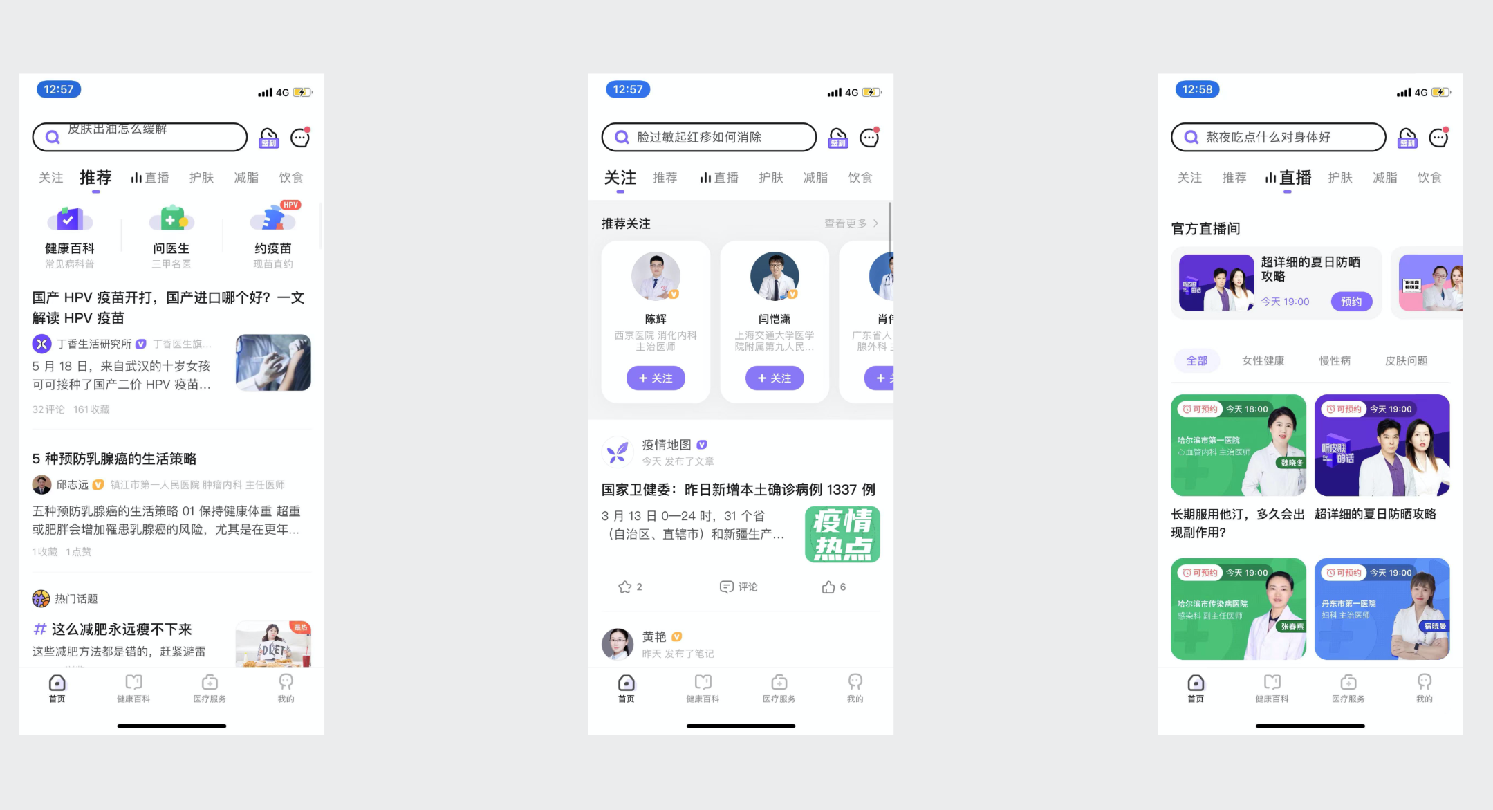 这是一个功能类产品的 UI 设计,设计师把提供的医疗服务分模块划分,比如在线询问医生、预约疫苗接种等,除了医疗服务还有很多科普文章,生活常识等。