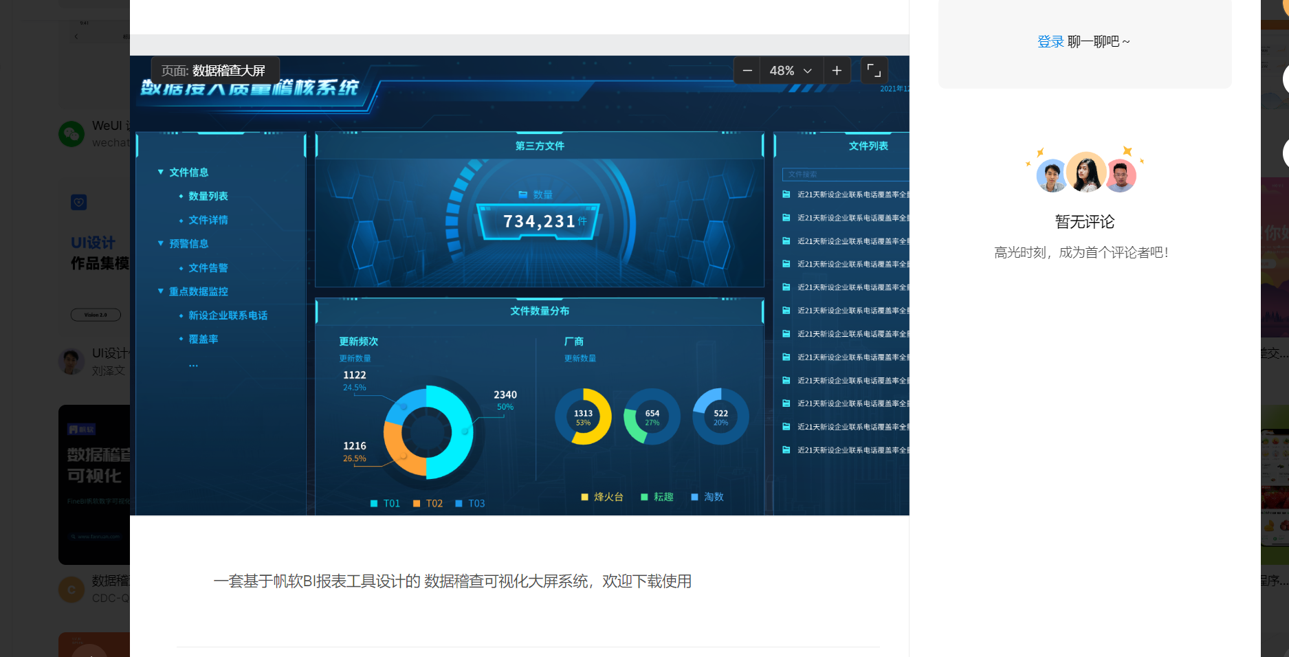 数据类的 UI 设计都可以参考这个案例,整体颜色应该尽量统一,突出数据和信息;数据应该使用不同的表现形式,比如下图中的饼状图,这样放在大屏上也会更加直观和清晰。