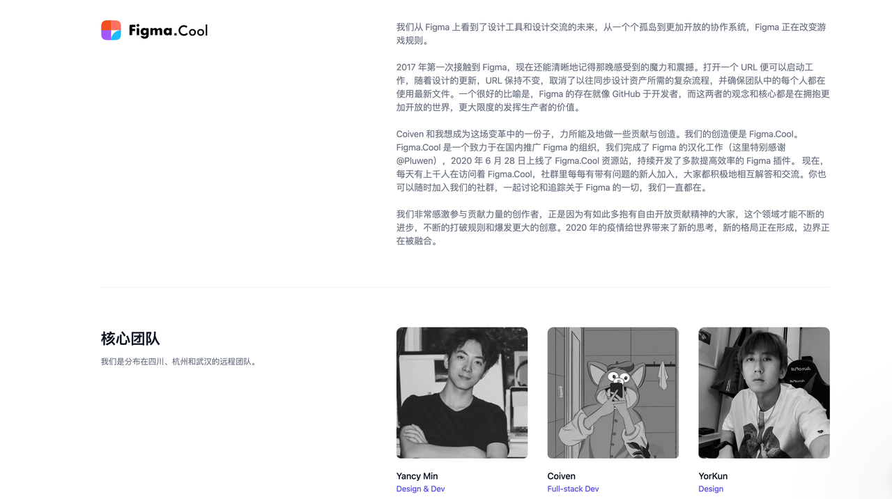 Figma.cool 主要是 3 个核心成员制作的,3位年轻人本身就是设计师或者前端工程师,因此官网十分美观的同时又具有稳定的功能。