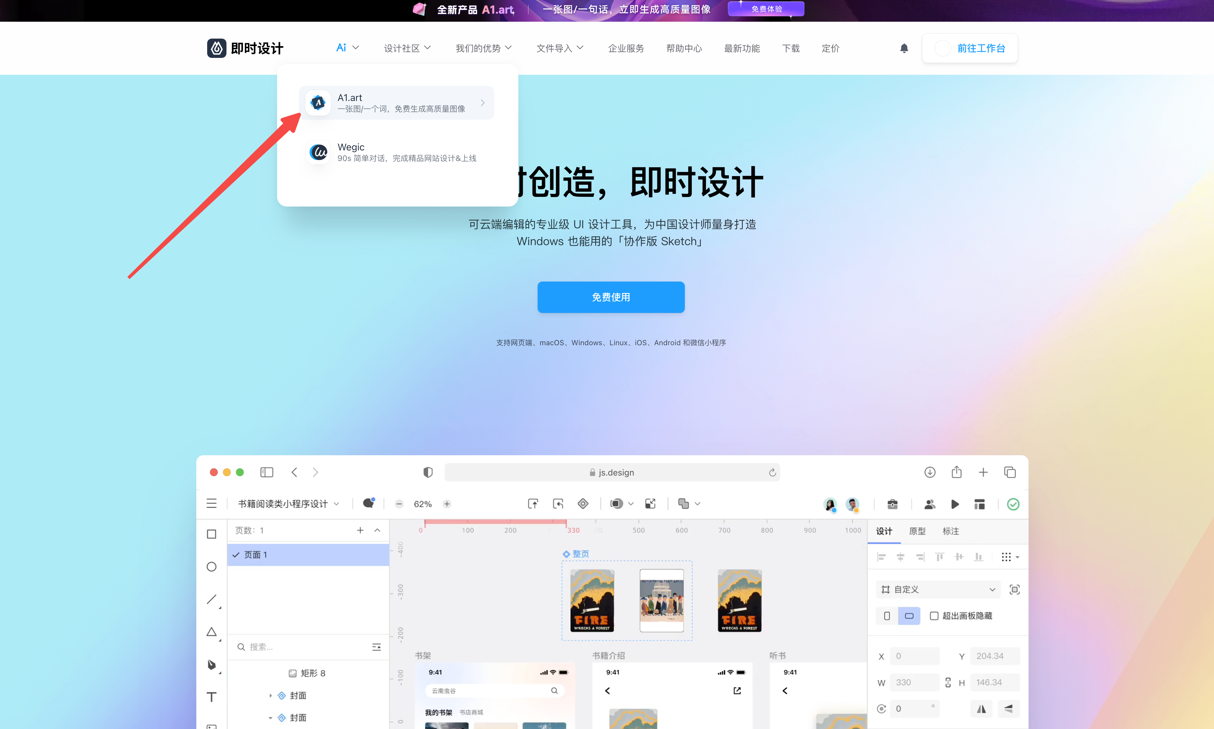 即时设计还有一个杀手锏功能——A1.art 图像生成平台。你可以通过上传参考图片或输入文字描述,直接生成高质量的AI图像。这个功能对于UI设计师来说太实用了,比如你需要一张特定风格的背景图、或者一个概念化的产品渲染图,不用再去素材网站翻半天,直接AI生成就行。