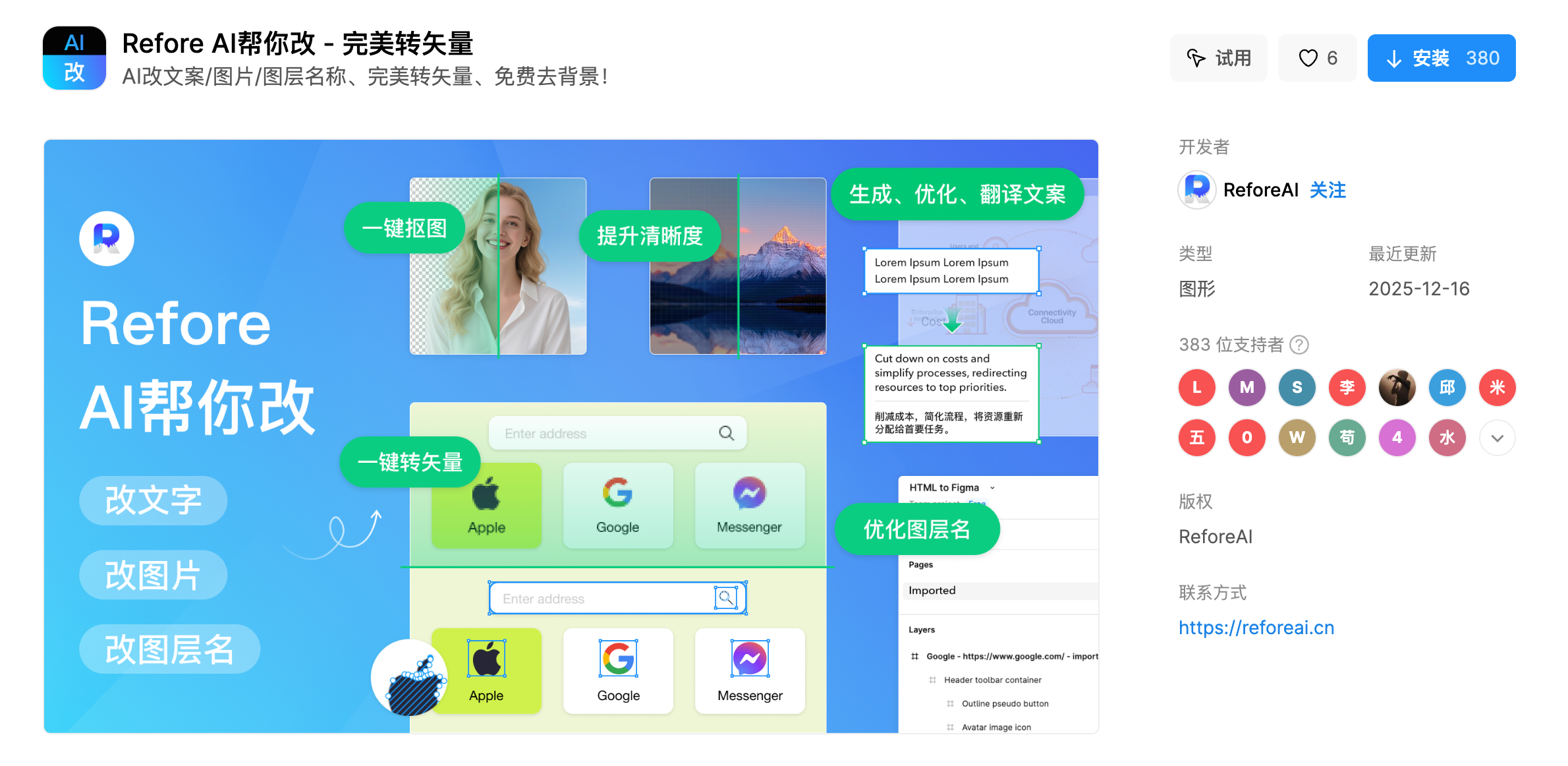 - Refore AI帮你改:这个插件支持AI改文案、图片、图层名称,还能完美转矢量、免费去背景。我用过几次,去背景的效果和Figma自带的差不多,但关键是完全免费。