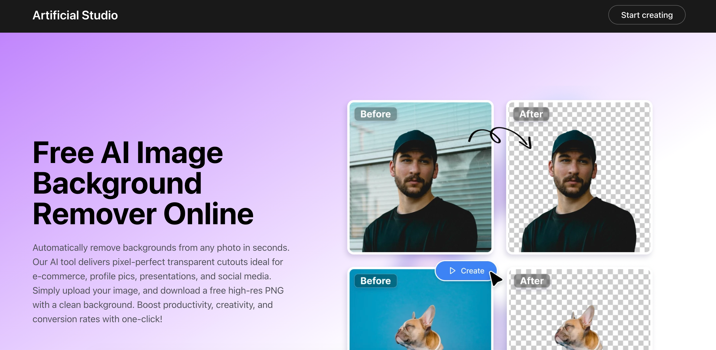 ArtificialStudio 提供一个非常干净、一键式的免费AI智能抠图软件,界面简洁,使用体验流畅。