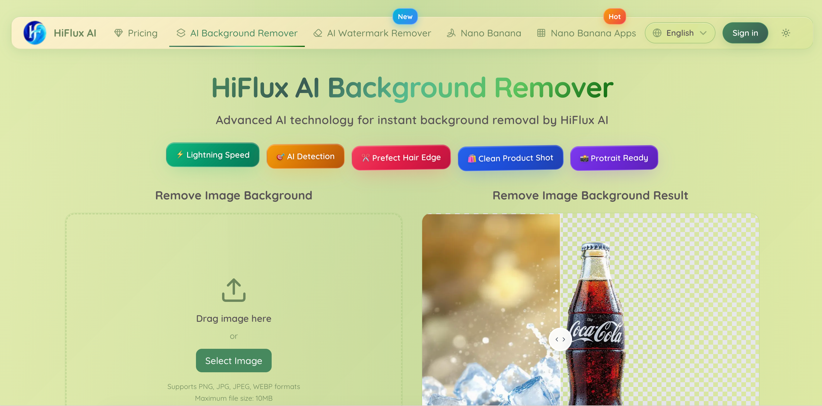 HiFlux AI 提供一个非常专业的AI背景移除工具,聚焦细节处理,如头发、毛发边缘。