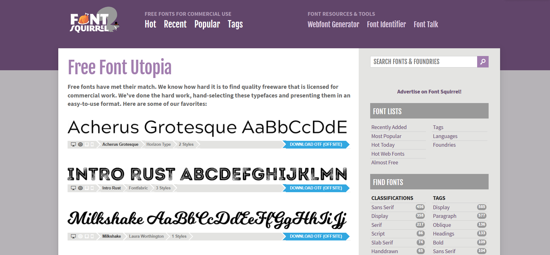 Font Squirrel,一个专们为设计师和开发者提供免费商用字体资源的网站。它能够为用户提供大量高质量字体,而且字体库中的内容都经过了高质量的筛选,覆盖了了多种设计风格。且这些字体都有商用许可证,支持设计师无限制使用。