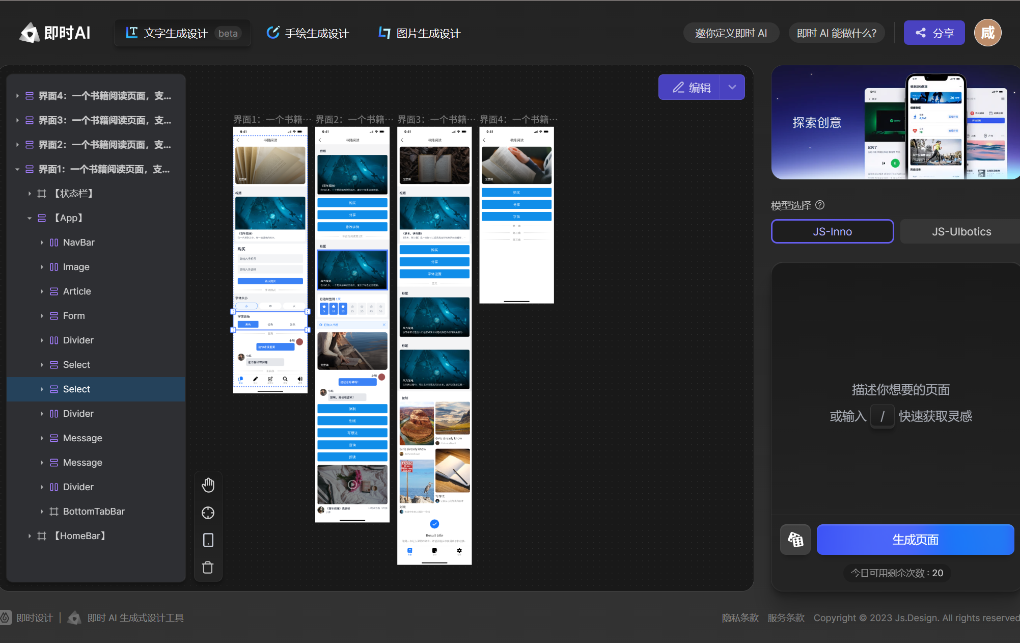 「即时 AI」作为即时设计中的内置功能,目前正在飞速发展中,不仅有通过文字描述就能绘制出矢量图的「即时 AI 画廊」,更有全球首个能够实现 AI 生成可编辑 UI 设计稿的「即时 AI」正在万人内测的过程中。这些 AI 辅助功能的发展让“设计”这件事变得更加容易,也让设计师能够借助智能工具更好更快地完成头脑风暴,提升设计质量。