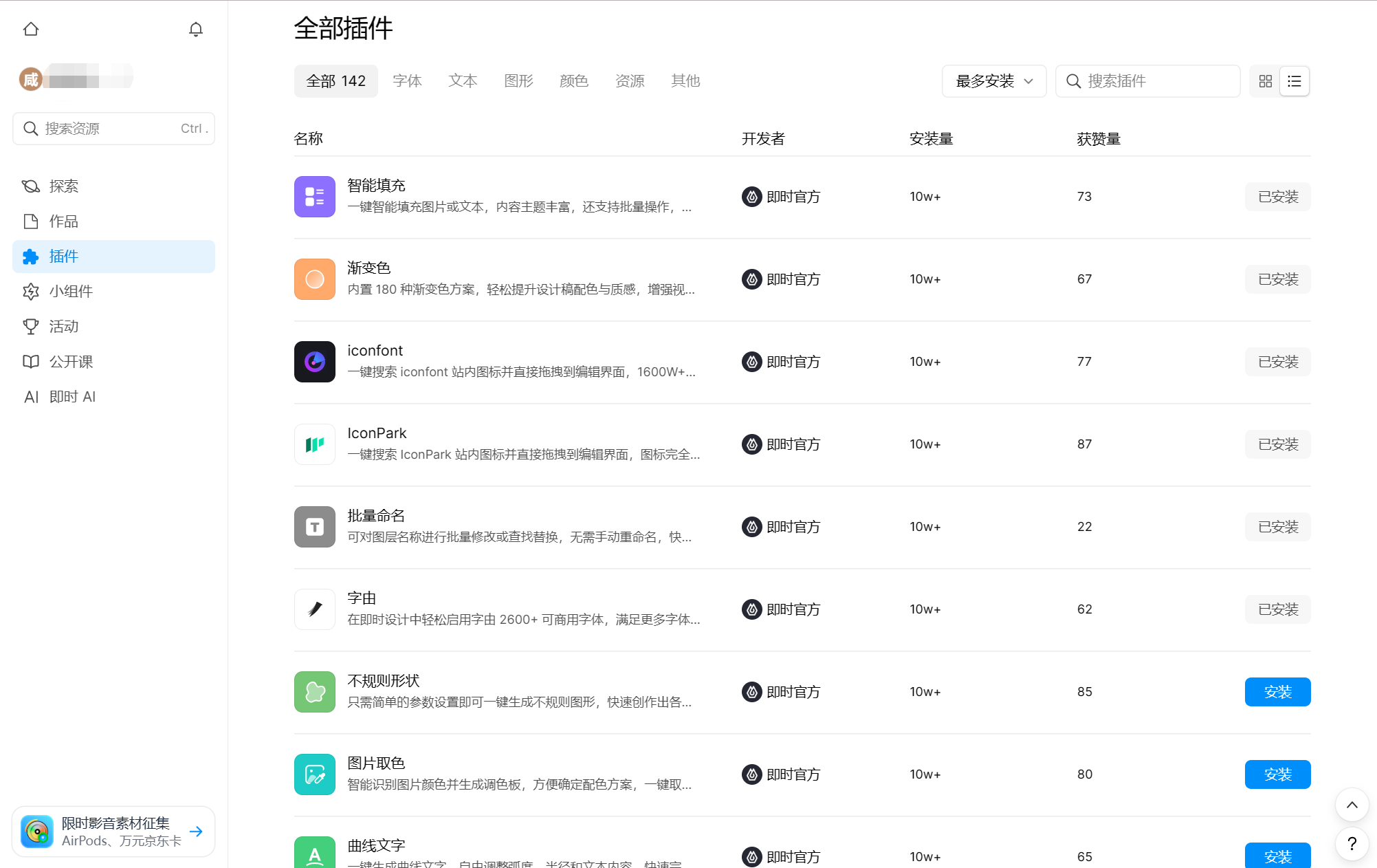 正如上文提到的,即时设计有着丰富的插件系统,通过首页顶部导航栏中的「设计社区」-「插件广场」便能进入。目前即时设计已上线超过 100 个插件,涵盖了字体、颜色、图形等多方面用户所需功能,只需安装后便能在网页流畅使用,不占用本地内存,唤醒方便。