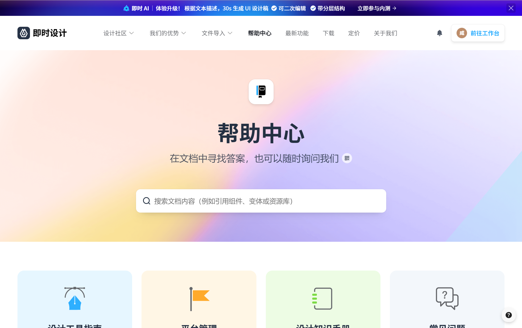 从操作方面来谈,即时设计的操作非常简单,界面清晰,即便是在之前没有接触过设计的用户也能很快地上手掌握。同时,即时设计官网首页的「帮助中心」板块为用户提供了多方面的功能解答,只需要键入关键词便能进行对应搜索,除了官方解答外还能获取用户的使用体验,能够让新手更快掌握即时设计的使用方法。