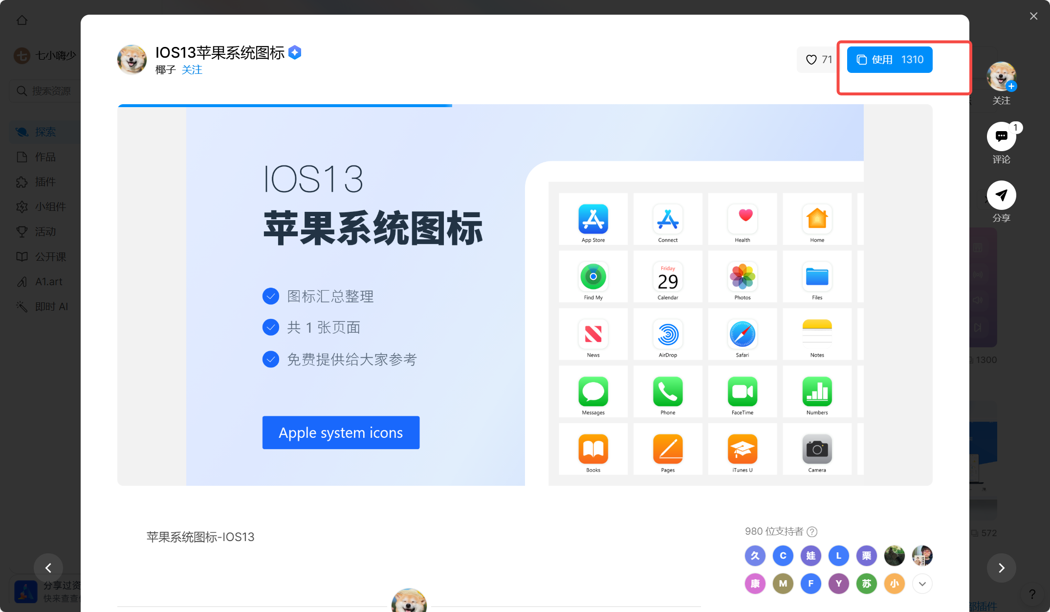 不仅资源覆盖面广,使用起来也是非常方便,点击素材右上角的“引用”即可成功打开素材并跳转至即时设计工作台,接下来就可以对素材进行编辑或修改啦~