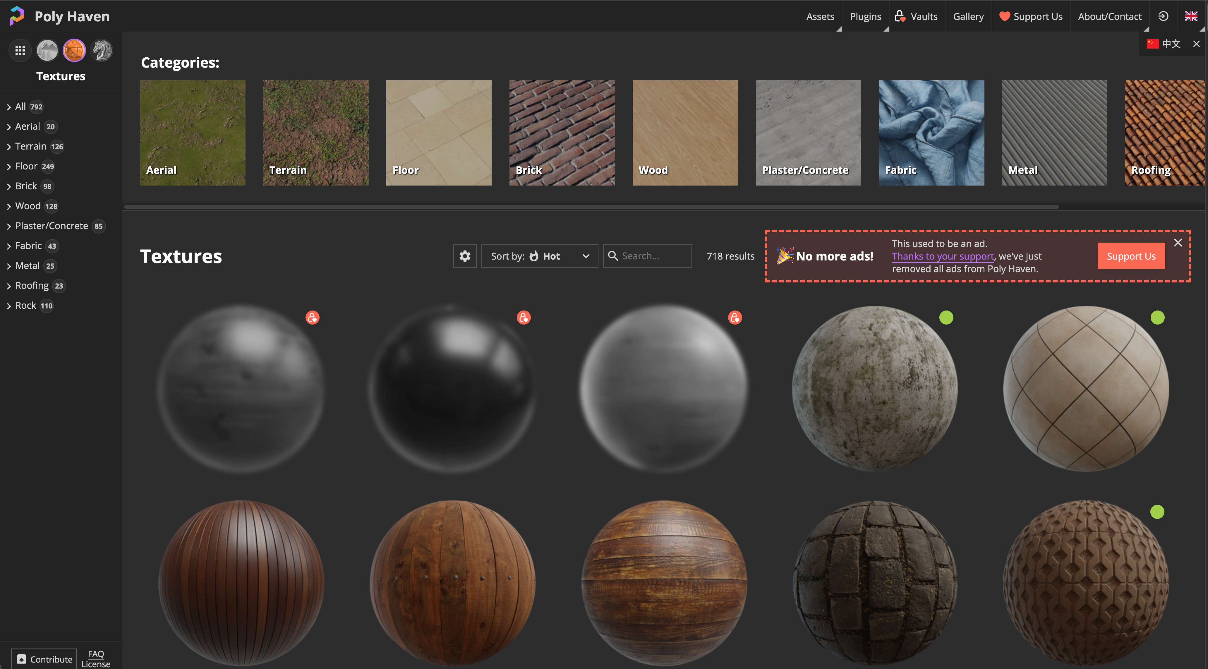 Poly Haven(原 HDRI Haven + Texture Haven 合并)提供贴图、HDRI 与模型,是 3D 设计师最常用网站之一。