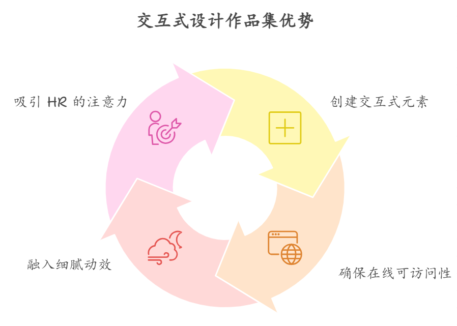 为每个项目按“背景 → 问题 → 过程 → 结果”结构组织内容。同时设计哪些互动元素(如点击查看、滑动触发动画、模拟流程)适合展示。