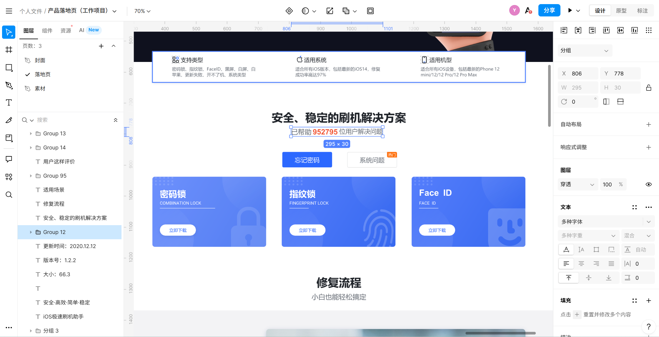 在即时设计中,编辑文字框,写下页面标题与副标题。标题要简短、有力,比如:“安全、稳定的刷机解决方案”。