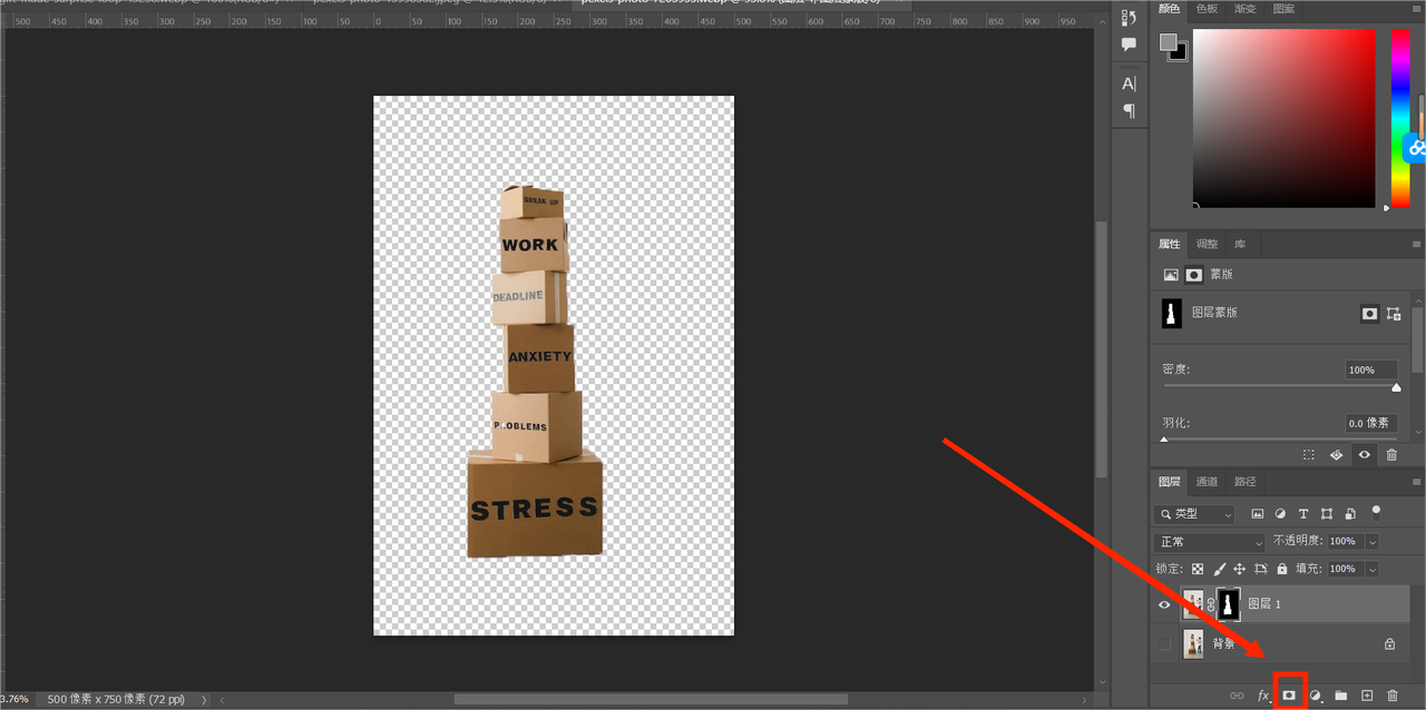 - 调整结束后,我们需要找到如图所示的图层面板下方的左数第三个图标,点击添加矢量蒙版,将选区单独提取出来,即可将目标内容抠取完毕。