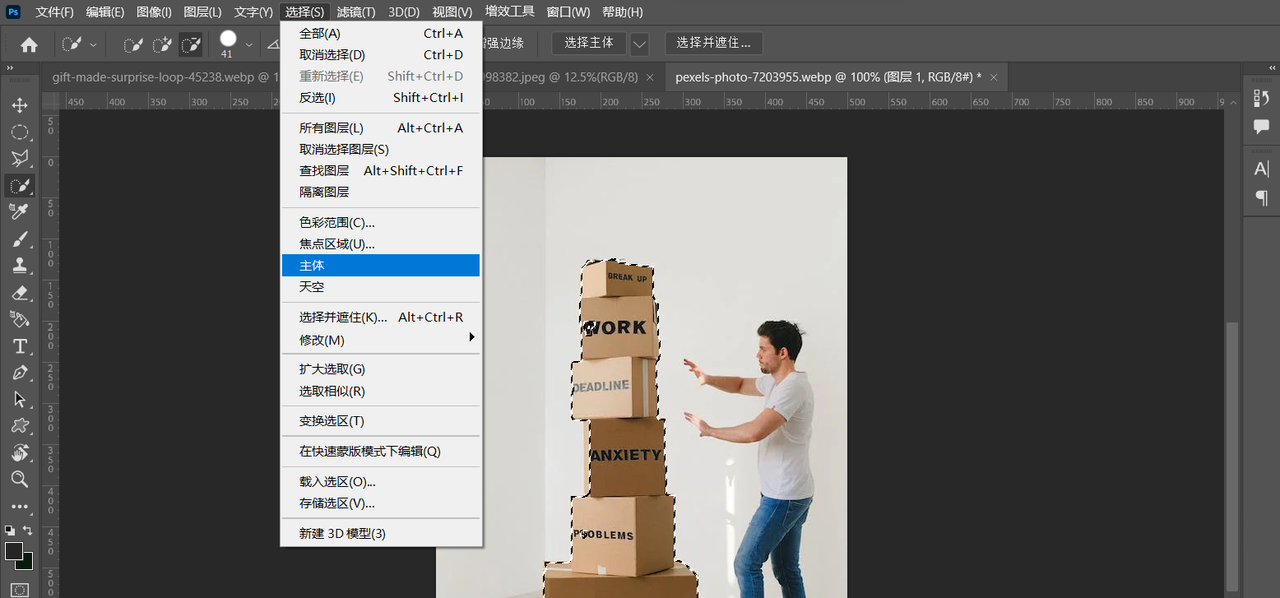 - 执行操作后,PS 会自动对图片主体进行选区,一般情况下,很多画面构成比较简单的图片是不需要我们进行其他操作的,但有时候可能还是会出现选区不准确的问题,我们可以在左侧工具栏中找到「快速选择工具」,进行选区调整。
