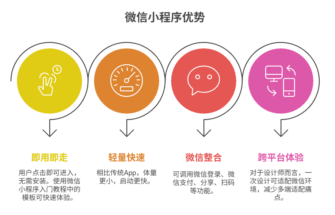 - 即用即走:用户点击即可进入,无需安装。使用 微信小程序入门教程 中的模板可快速体验。