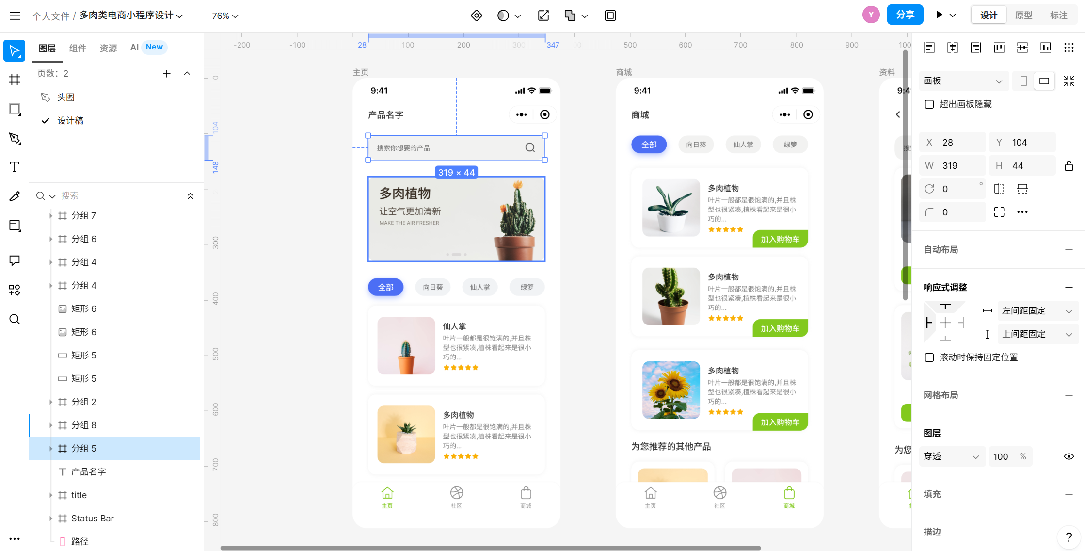 使用即时设计的小程序模板,可以大幅缩短做小程序的前期设计时间。模板中预设微信生态下常用页面(如首页、详情页、列表页、支付页等)及组件、交互逻辑。设计师只需替换内容、调整样式即可。