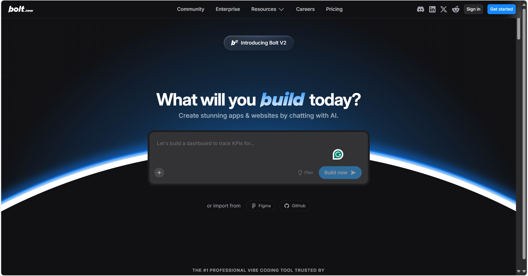 Bolt(也称 Bolt.new) 是一个更偏向于 AI 驱动、从自然语言或设计稿直接生成可用应用的工具,也可用于前端代码生成,属于一种下一代的一键生成前端代码工具形式。