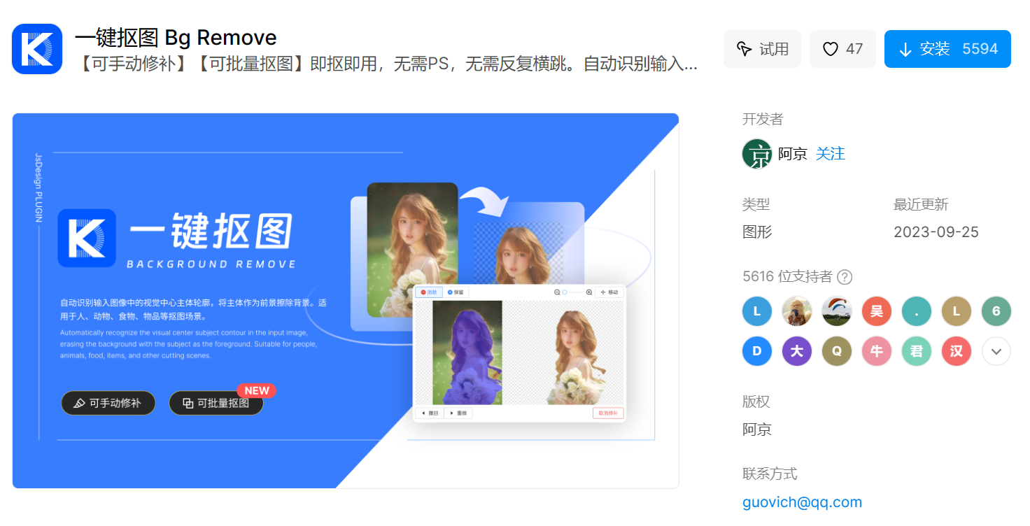 Bg Remove 抠图工具和上一个工具还是蛮相似的,都比较适合抠人像图片。不过个人体验来讲,它的边缘化处理不算很完善,不过对于一些简单的图像还是完全没问题的!点击注册即时设计,还可以发现更多智能抠图工具!