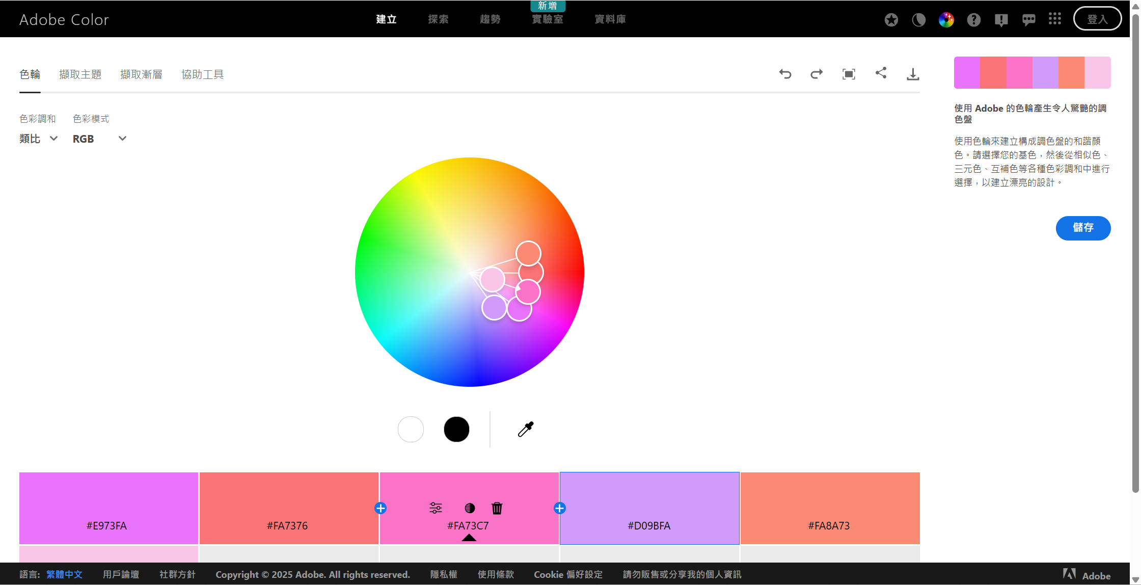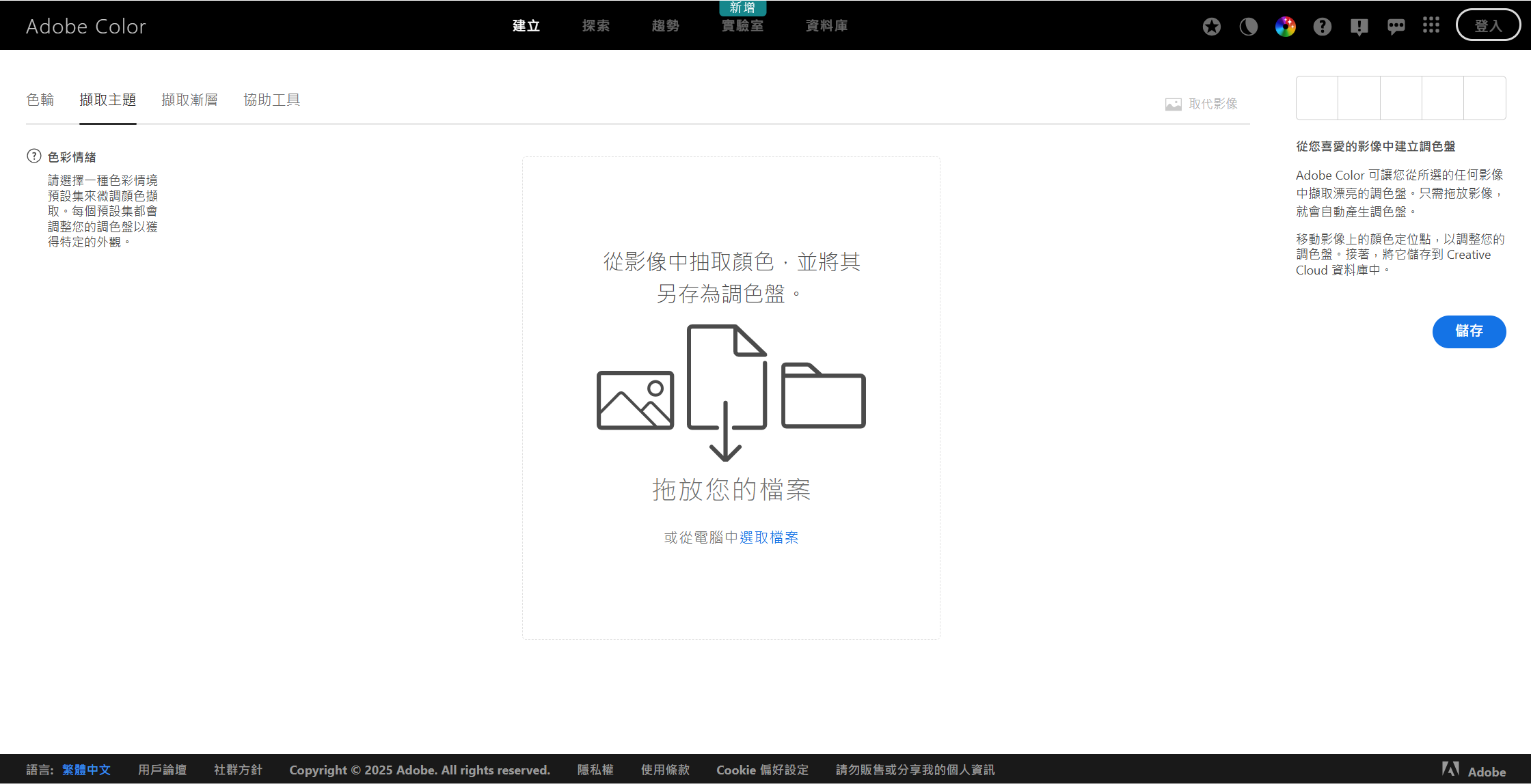 Adobe Color 支持上传图片提取主色、并生成配色方案,利于从照片、材质或环境中获取灵感,是一款特别推荐的便捷作品集配色网站。