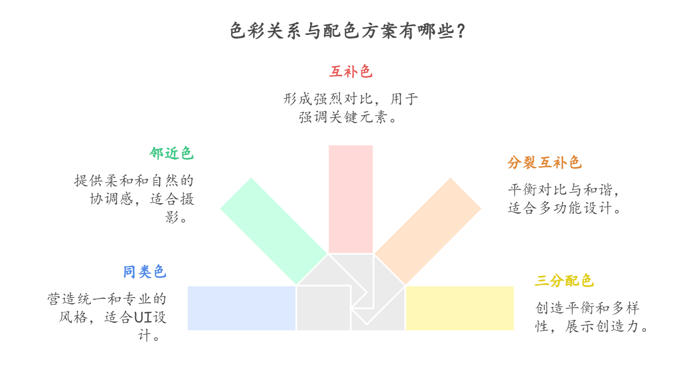 分裂互补色(Split Complementary)这是互补配色的柔和版本,由主色及其相邻的两种对比色组成,平衡了对比感与视觉和谐。适合想兼顾专业与活力的设计师。