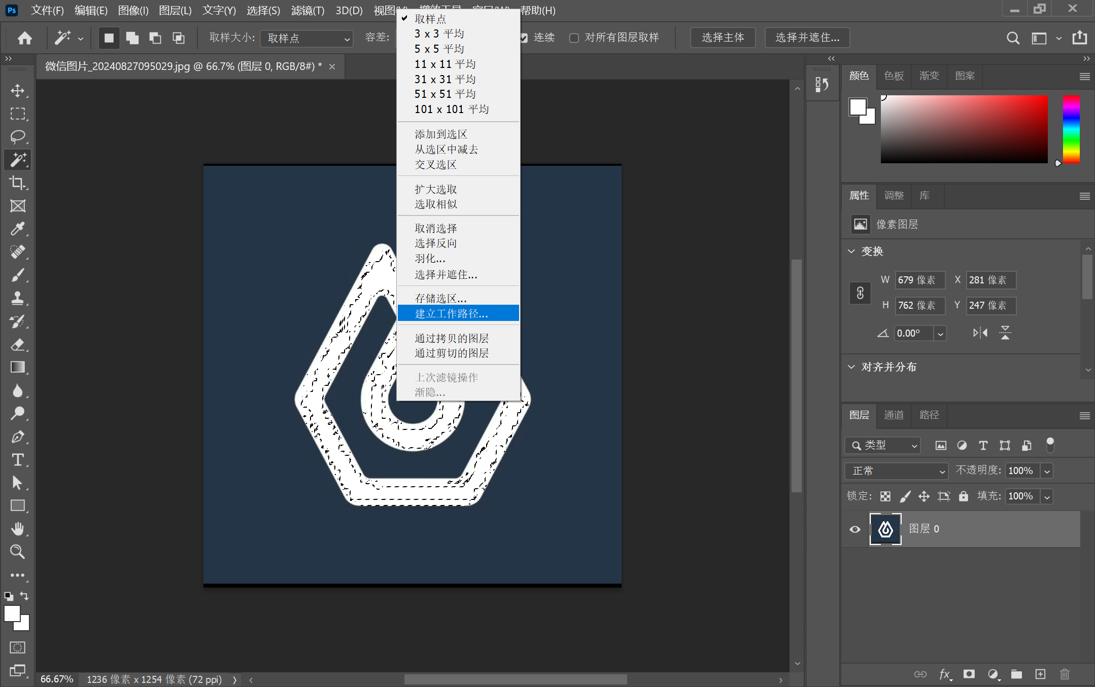 第三步:这时我们会看到 Logo 已经被描出了边缘,接着点击左侧工具栏中的魔棒工具,将鼠标移动到图形,然后点击鼠标右键,点击建立工作路径。
